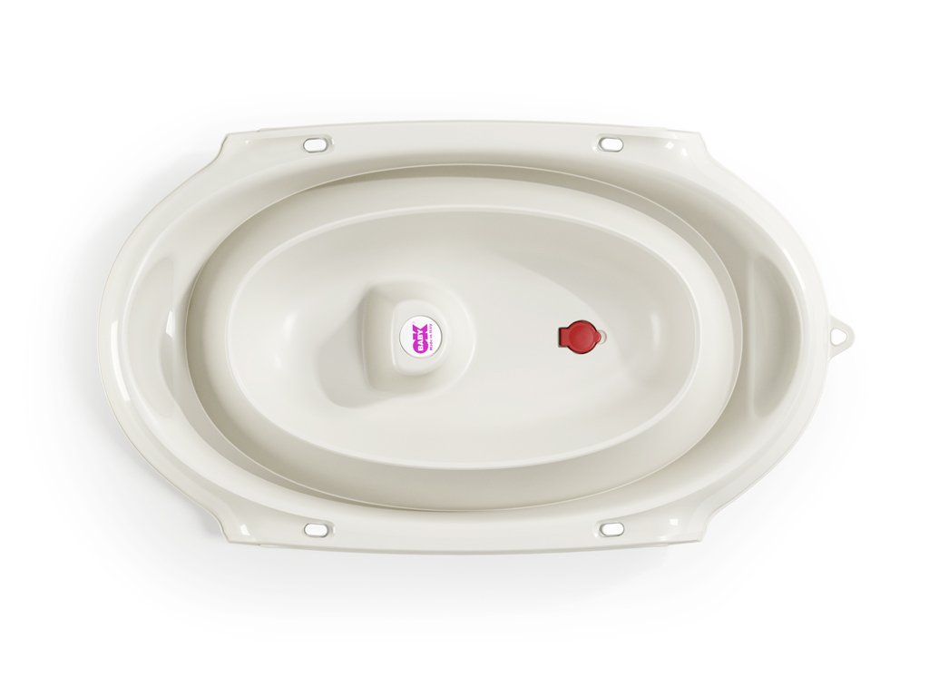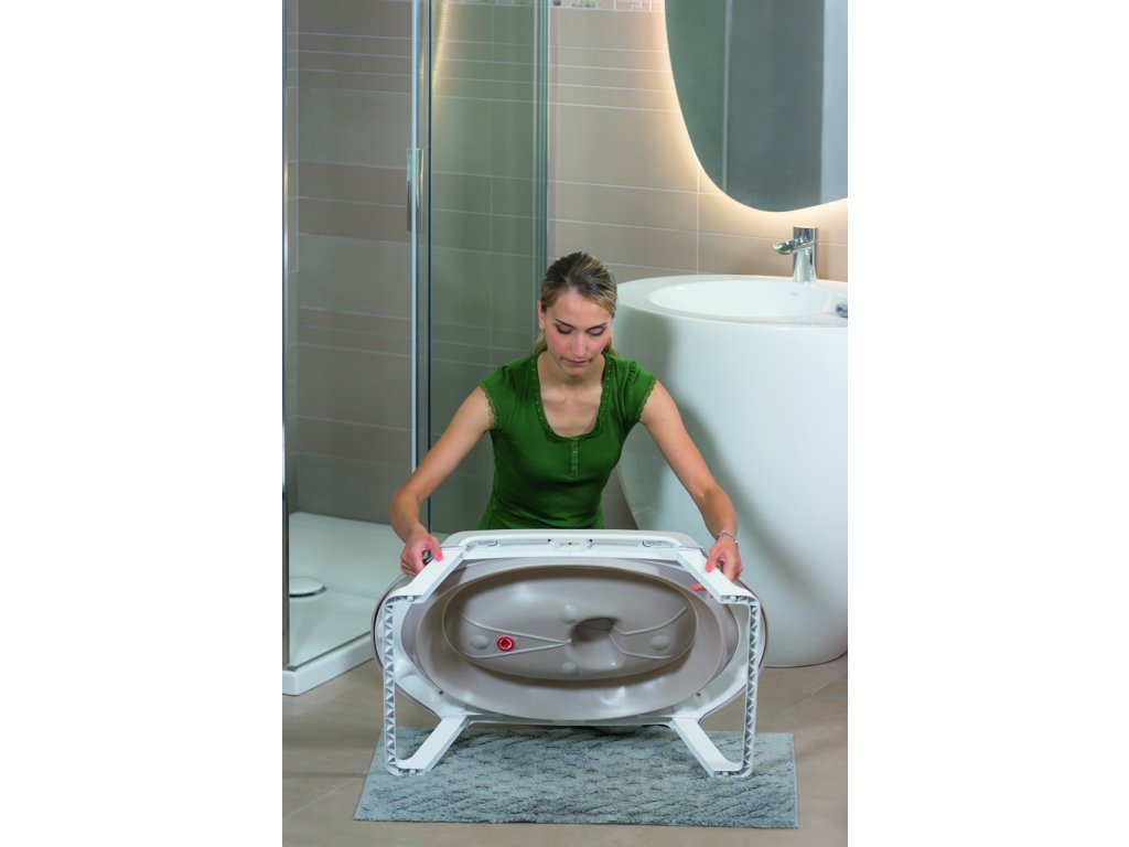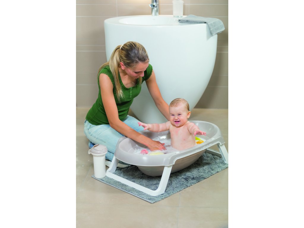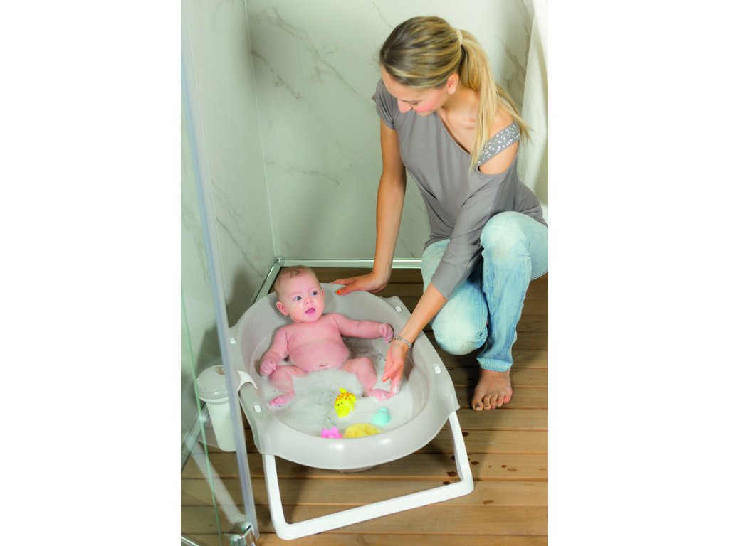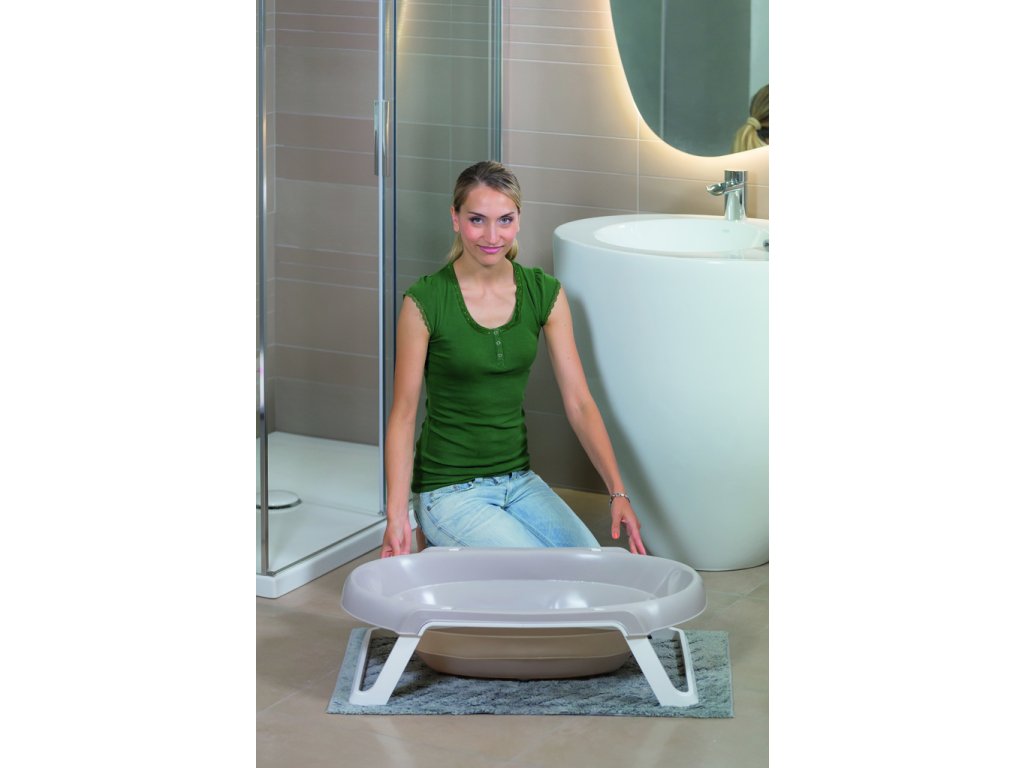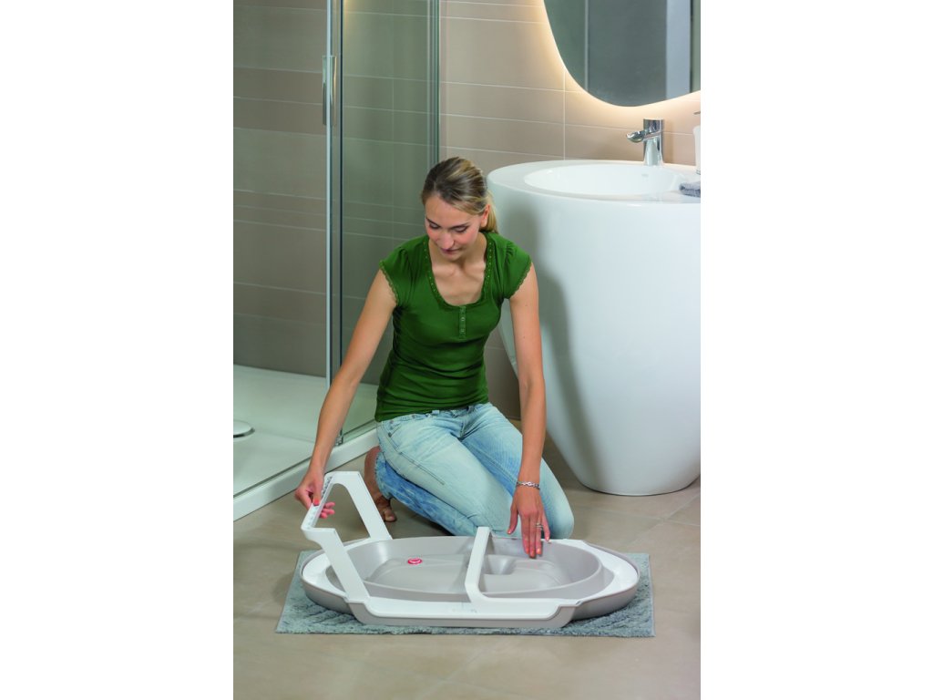- A kád a gyermek lábai közé egy rögzítő ponttal van ellátva, amely megakadályozza a kicsúszást. E funkció révén a kád két ülőpozícióban használható, amelyek lehetővé teszik a gyermek számára, hogy jó pozíciót tartson növekedése során (0/6 hónapos és 6/12 hónapos korban), és mozgatni tudja a lábait és a karjait.