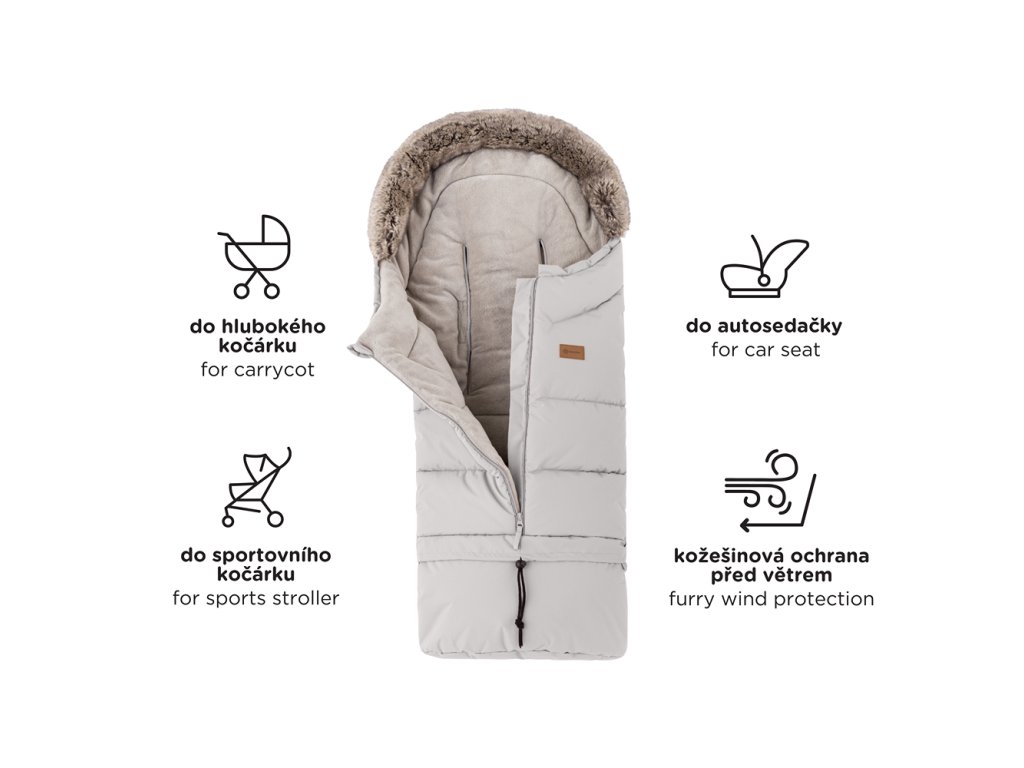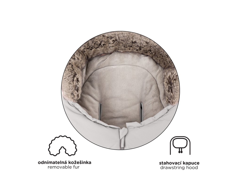 - 4 az 1-ben - az alsó rész leválasztásával a hálózsák mérete kisebbre változtatható, amely babakádba vagy autósülésbe is illeszkedik, a szőrme rögzítésével pedig szélvédelmet kap.