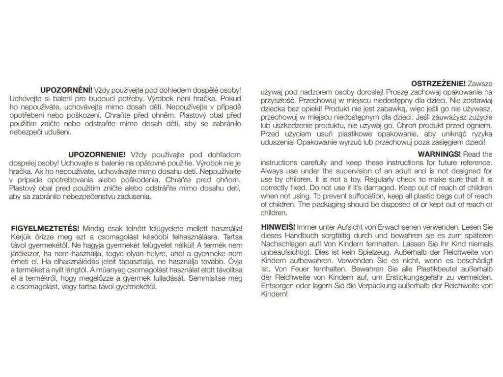 FIGYELMEZTETÉS Mindig felnőtt felügyelete mellett használja! Őrizze meg a csomagolást későbbi felhasználás céljából. A termék nem játék. Ha nem használja, tartsa távol gyermekektől. Ne használja kopás vagy sérülés esetén. Óvja a tűztől. A műanyag csomagolást semmisítse meg, vagy tartsa távol gyermekektől, hogy elkerülje a fulladásveszélyt.
