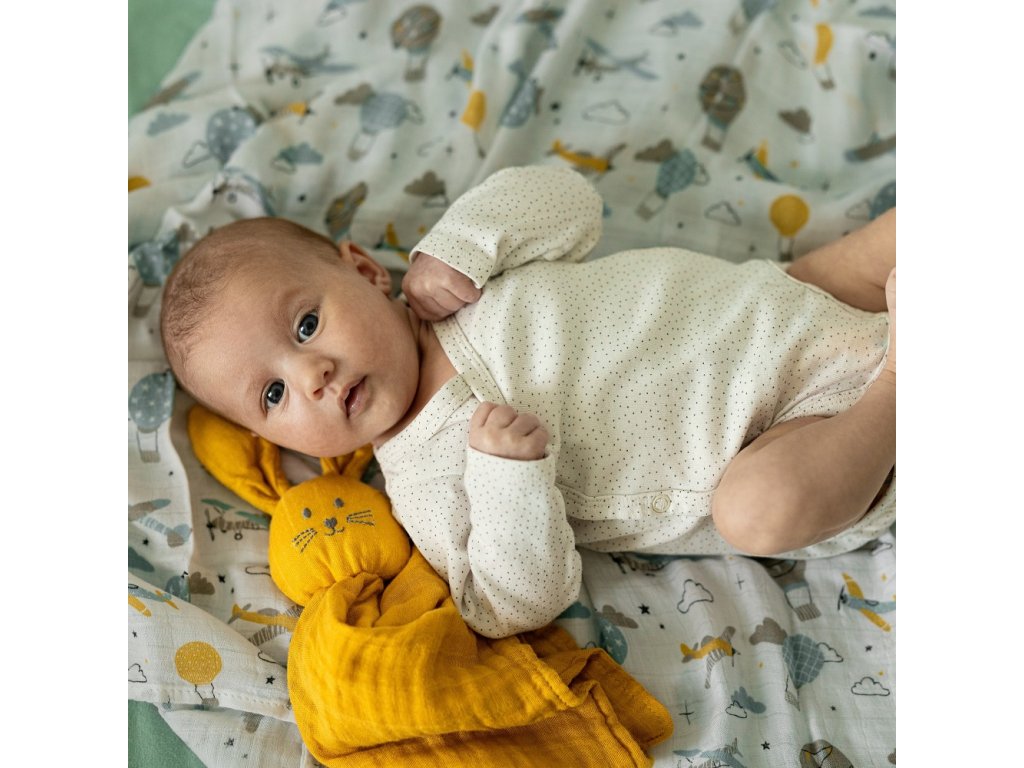A Misty pólyák mellett a bambusz muszlin termékcsalád bambusz Moussy pelenkákat és egy aranyos Huga nyuszit is tartalmaz az ágyba.
