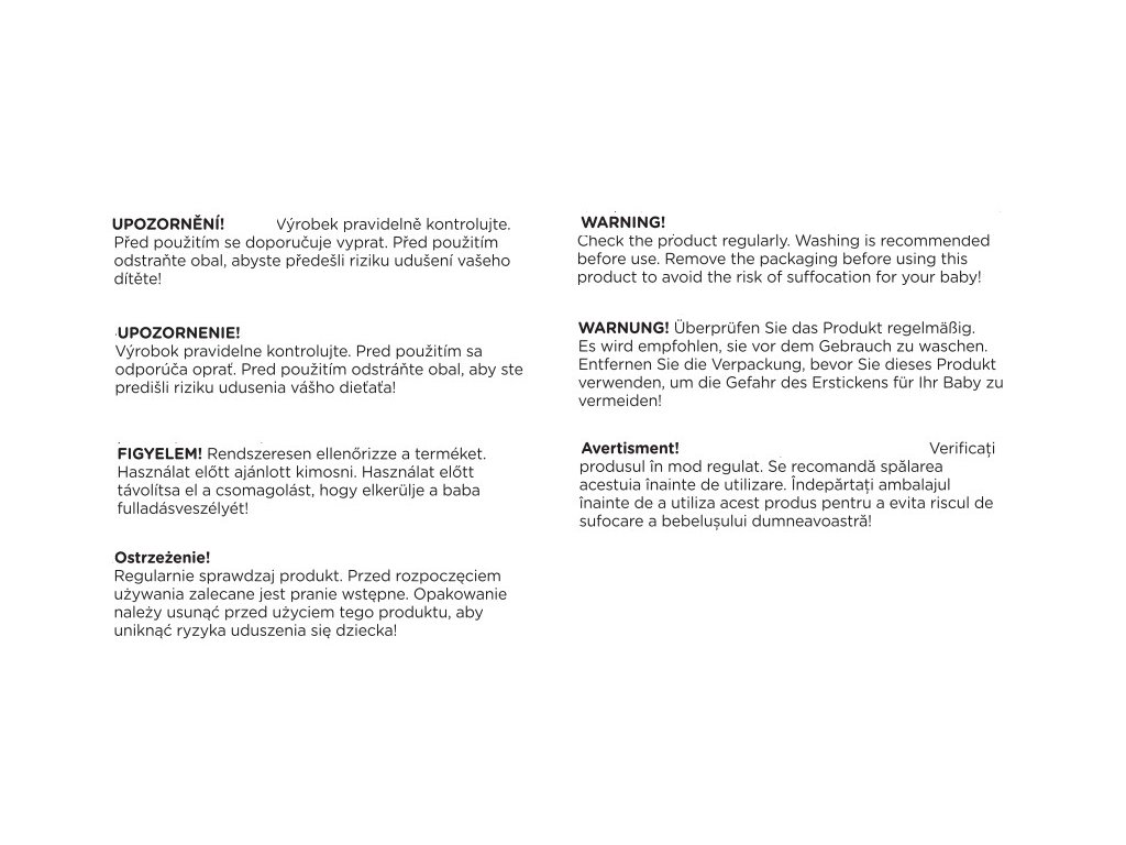 FIGYELMEZTETÉS Rendszeresen ellenőrizze a terméket. Használat előtt ajánlott kimosni. Használat előtt távolítsa el a csomagolást, hogy elkerülje a gyermek fulladásának kockázatát!
