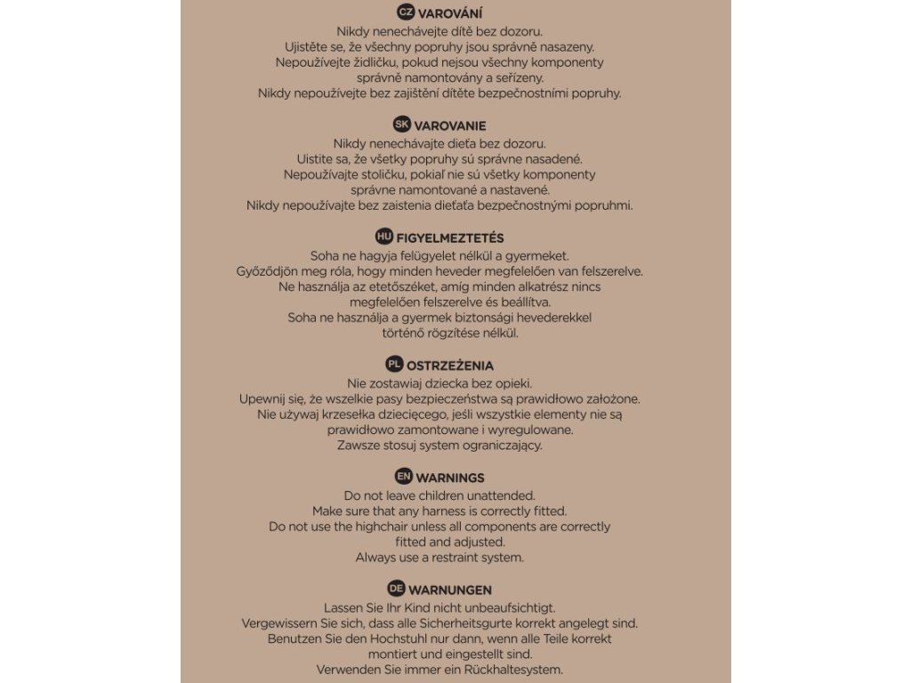 FIGYELMEZTETÉS Soha ne hagyja a gyermeket felügyelet nélkül. Győződjön meg arról, hogy minden heveder megfelelően van rögzítve. Ne használja a széket, amíg minden alkatrész megfelelően nincs felszerelve és beállítva. Soha ne használja a széket anélkül, hogy a gyermek be lenne kötve a biztonsági övekkel.
