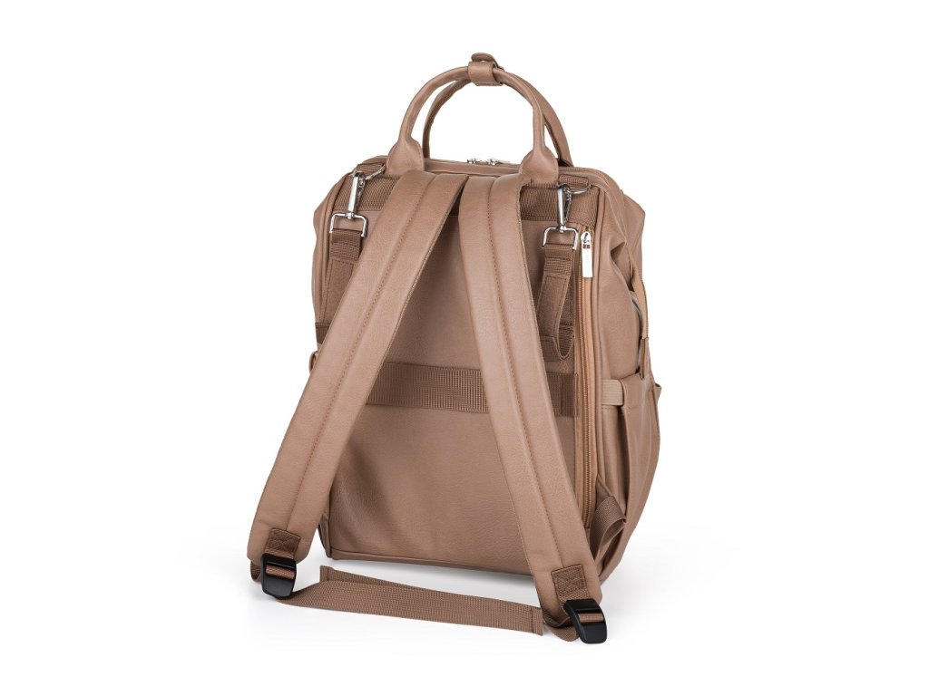A hátizsák kevesebb, mint egy kilogramm, és kiváló minőségű, vízálló PU anyagból készült a stabilitás és a hosszú élettartam érdekében. Az oldalsó, levehető pántok lehetővé teszik, hogy a hátizsákot könnyedén rögzítse bármilyen márkájú babakocsihoz. A extra habréteggel ellátott vállpántok kényelmet biztosítanak hosszabb viselés esetén is, a világos színű belső bélés pedig megkönnyíti a szükséges dolgok gyors megtalálását és a rend fenntartását.