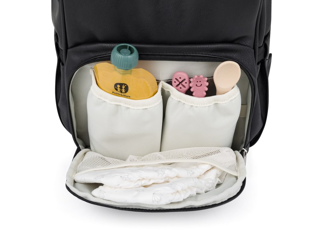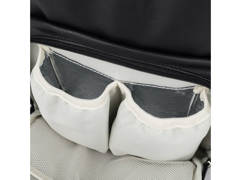 A tágas főrekesz, amely kétirányú cipzárral záródik, szélesre nyílik, így könnyen hozzáférhet minden szükséges dologhoz. A hátizsák tizenkét funkcionális zsebbel rendelkezik, beleértve egy külön zsebet a táblagép vagy a nedves törlőkendők számára, egy hőszigetelt zsebet, egy vízálló zsebet a nedves dolgok számára, valamint egy helyet a palackok és a kulcsok számára.