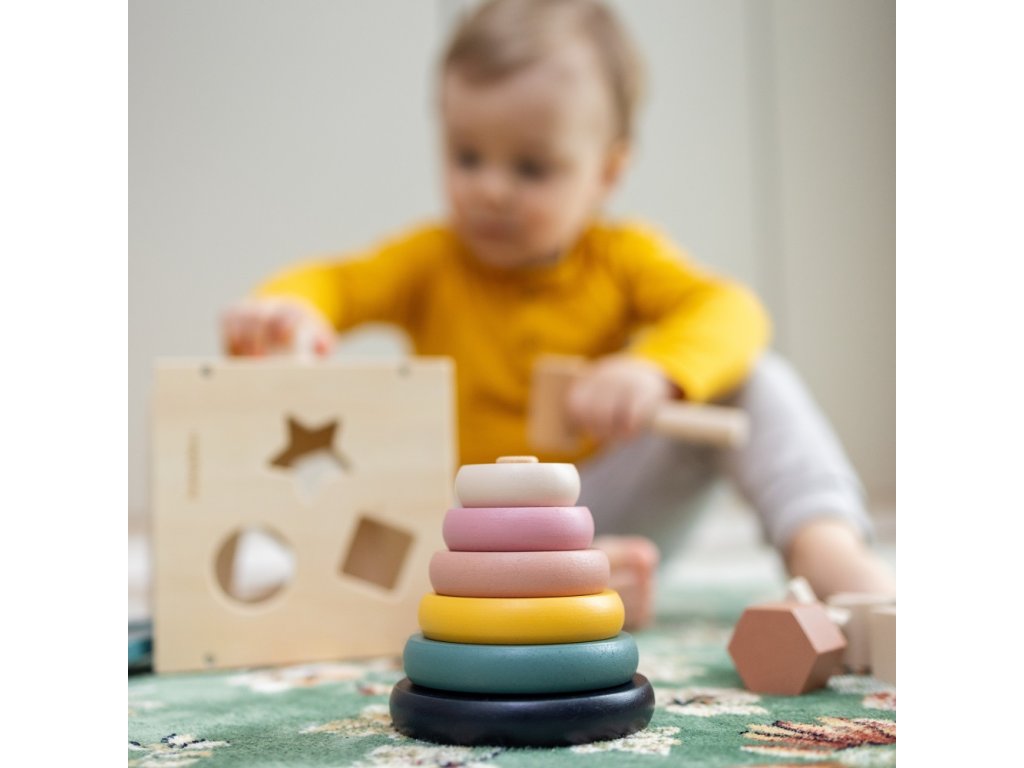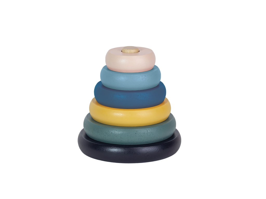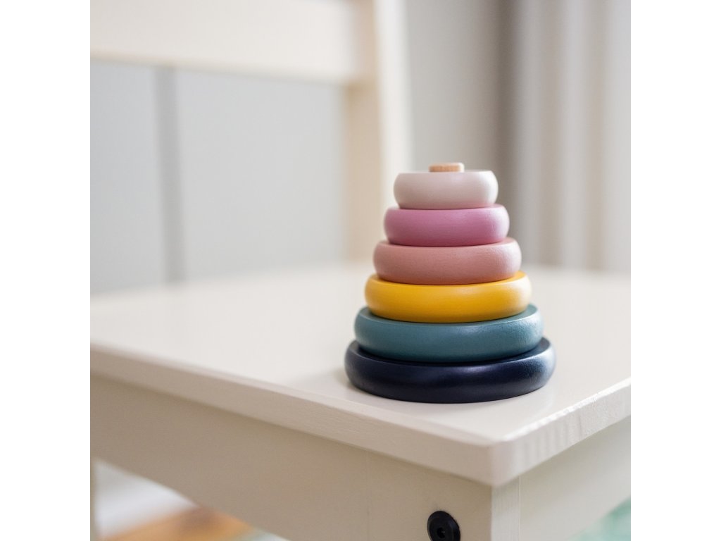A piramis 6 színes korongból áll, amelyeket a gyermek a csappal ellátott alapra helyez. A játék tökéletesen fejleszti a megfigyelőképességet és logikus gondolkodásra tanít. A szilárd kidolgozásnak köszönhetően stabil és tartós.