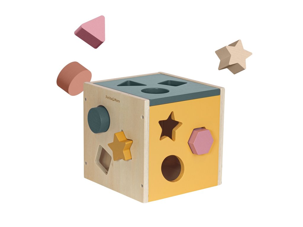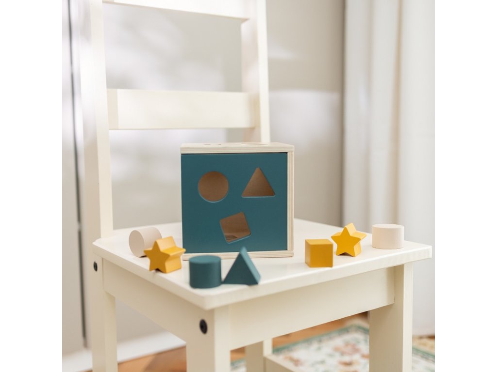 A készlet tartalmaz egy fa kockát négy oldallal a válogatáshoz és 12 színes kockát különböző formákkal, például háromszöggel, csillaggal, négyzettel, rombusszal vagy körrel.