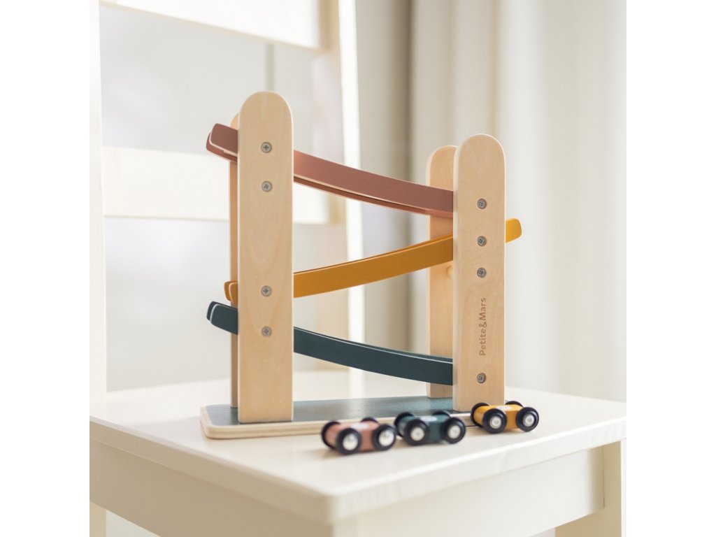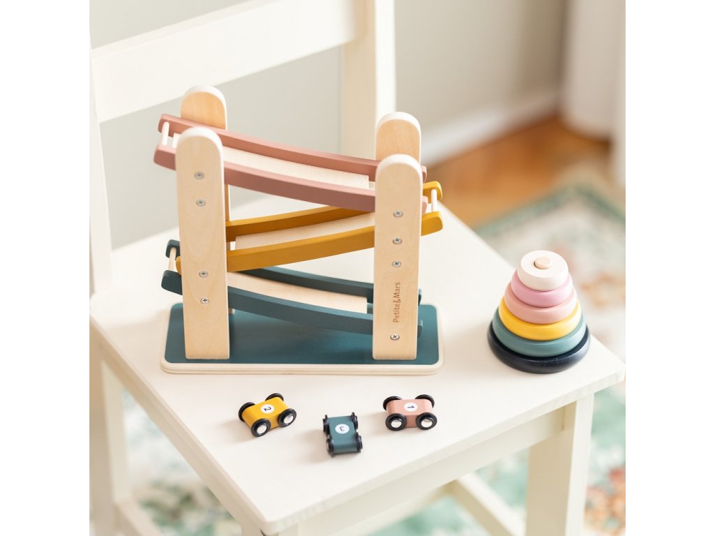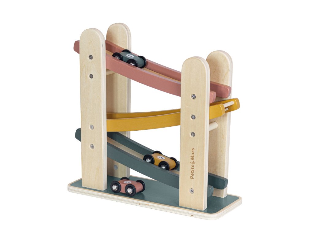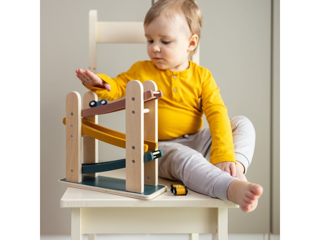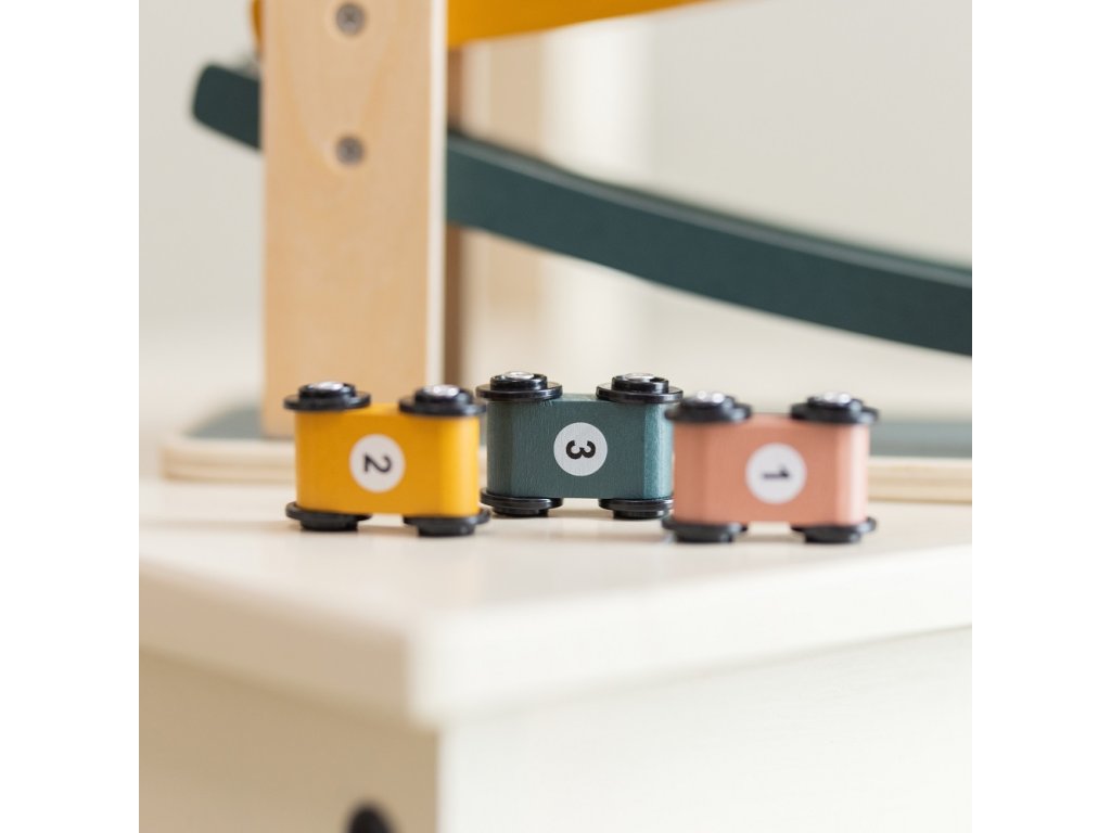 A MILKY WAY fa versenypálya a kis versenyrajongók számára egy többszintű kaland. A készlet 3 szintből és 3 kis autóból áll, amelyek felülről lefelé indíthatók, ami vonzó szórakozást nyújt. Az autók külön versenyzésre is használhatók, a pálya minimalista dizájnja pedig finom, visszafogott színekben tökéletesen illeszkedik a gyerekszobába.