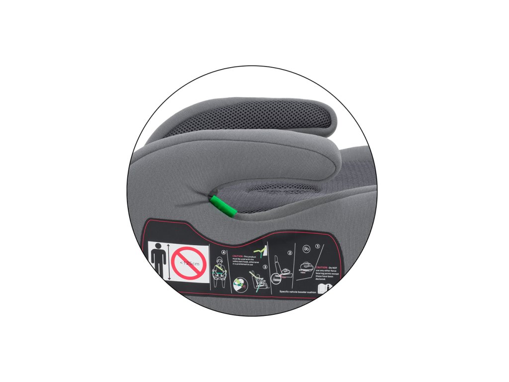 A gyermek biztonságát a jármű hárompontos biztonsági öve biztosítja, amellyel a gyermek az autósüléshez van rögzítve. Az ülésmagasító vezetőcsattal van ellátva a hevederek egyszerű és biztonságos beállításához, hogy ne menjen túl magasra (a nyakon keresztül) vagy túl alacsonyra (a váll alatt). Nagyon praktikus a könnyű szerkezetnek, a mosható huzatnak és a kartámaszoknak köszönhetően.