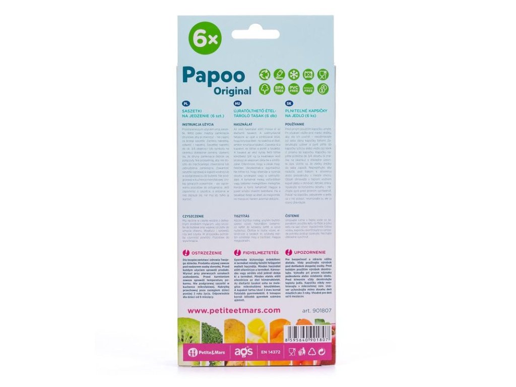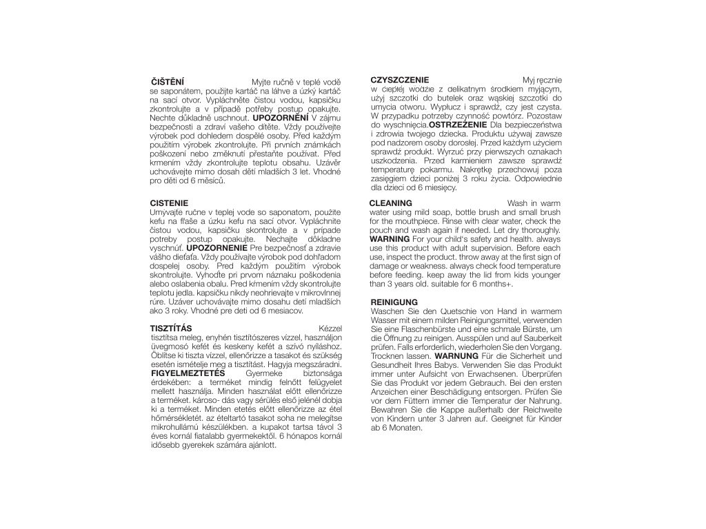 FIGYELMEZTETÉS Gyermeke biztonsága és egészsége érdekében. A terméket mindig felnőtt felügyelete mellett használja. Minden használat előtt ellenőrizze a terméket. A csomagolás sérülésének vagy gyengülésének első jelére dobja ki. Etetés előtt mindig ellenőrizze az étel hőmérsékletét. Soha ne melegítse a tasakot mikrohullámú sütőben. A kupakot tartsa 3 év alatti gyermekektől elzárva. 6 hónapos kortól alkalmas gyermekek számára.