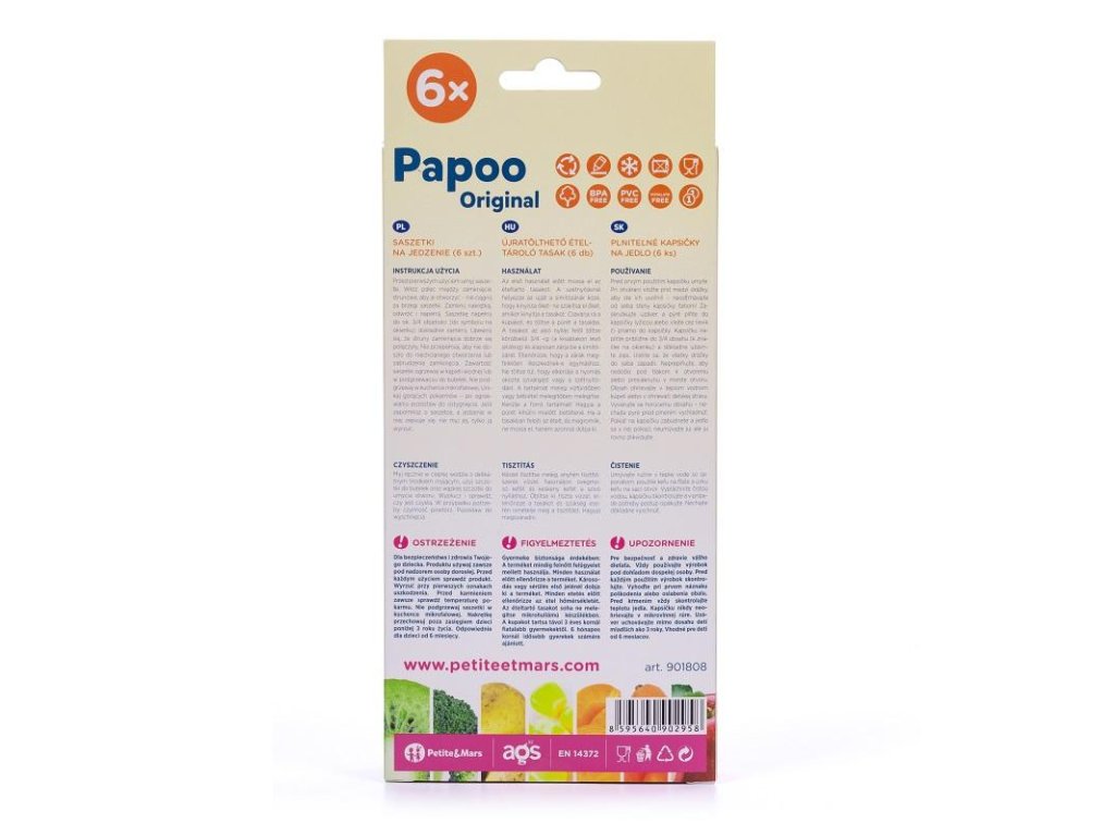 FIGYELMEZTETÉS Gyermeke biztonsága és egészsége érdekében. A terméket mindig felnőtt felügyelete mellett használja. Minden használat előtt ellenőrizze a terméket. A csomagolás sérülésének vagy gyengülésének első jelére dobja ki. Etetés előtt mindig ellenőrizze az étel hőmérsékletét. Soha ne melegítse a tasakot mikrohullámú sütőben. A kupakot tartsa 3 év alatti gyermekektől elzárva. 6 hónapos kortól alkalmas gyermekek számára.