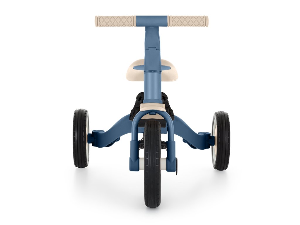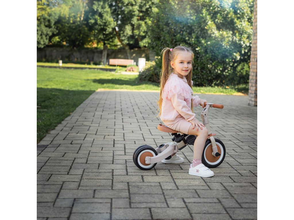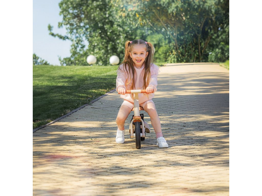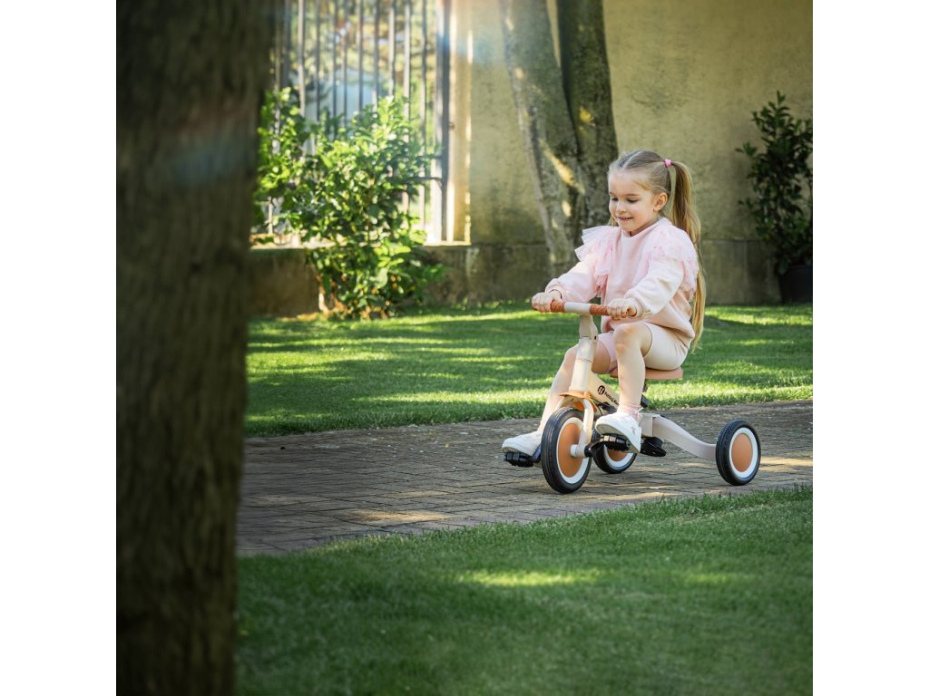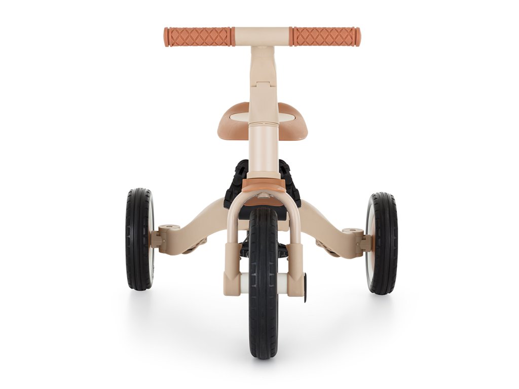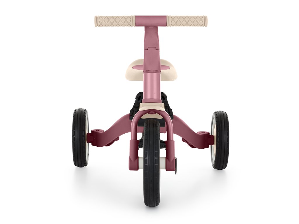 A csúszásgátló gumifogantyúkkal ellátott kormány állítható, a pedálok levehetők, a nyereg pedig a magassághoz igazodik, miközben az állítható biztonsági övek maximális biztonságot nyújtanak. A tartós gumikerekeknek köszönhetően a kerékpár ideális a két- és háromkerekű változatokhoz is, amelyek garantálják a stabilitást különböző felületeken.