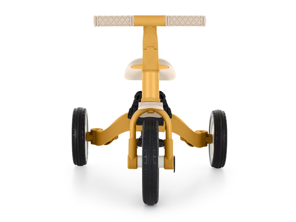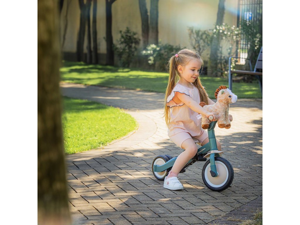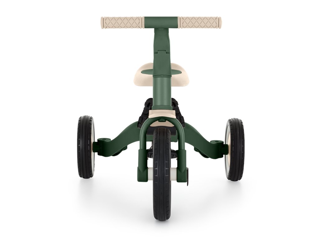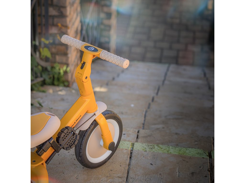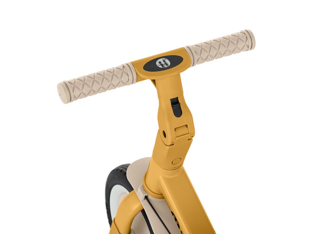 A csúszásgátló gumifogantyúkkal ellátott kormány állítható, a pedálok levehetők, a nyereg pedig a magassághoz igazodik, miközben az állítható biztonsági övek maximális biztonságot nyújtanak. A tartós gumikerekeknek köszönhetően a kerékpár ideális a két- és háromkerekű változatokhoz is, amelyek garantálják a stabilitást különböző felületeken.