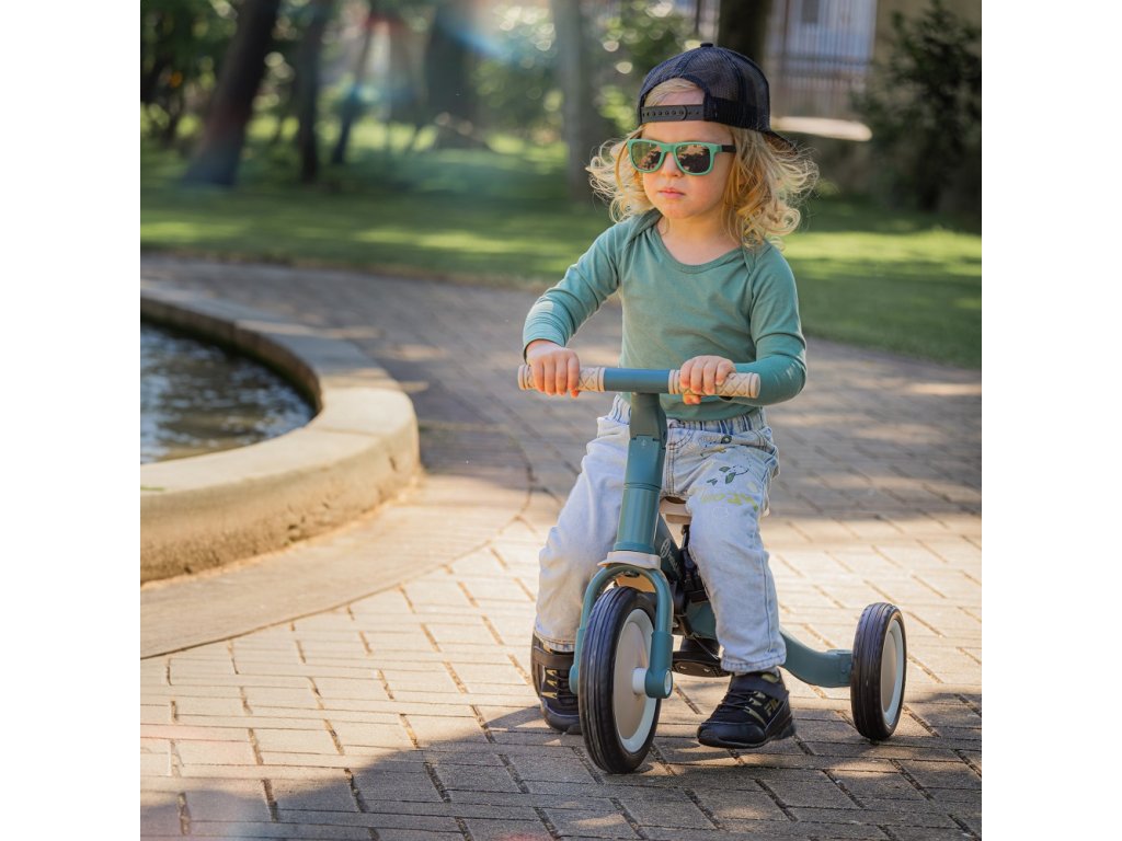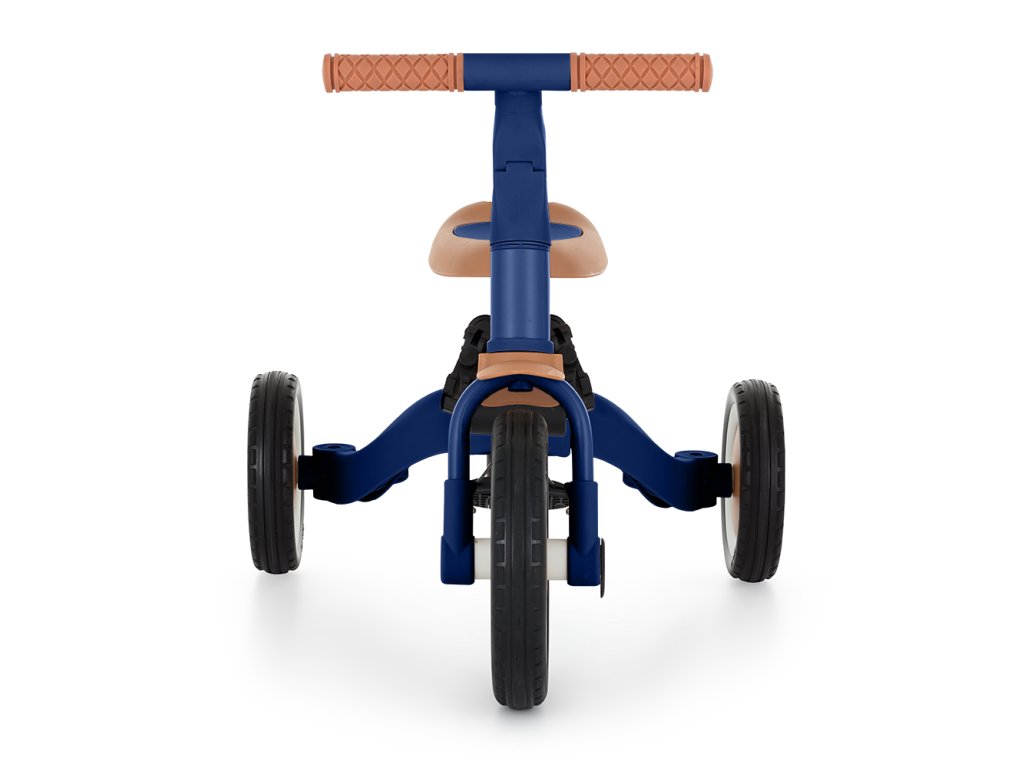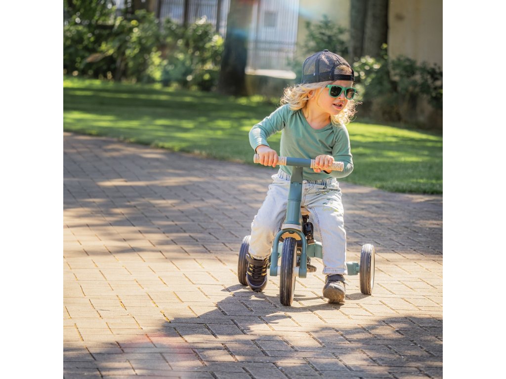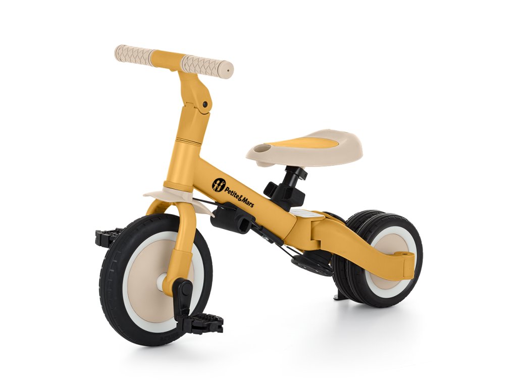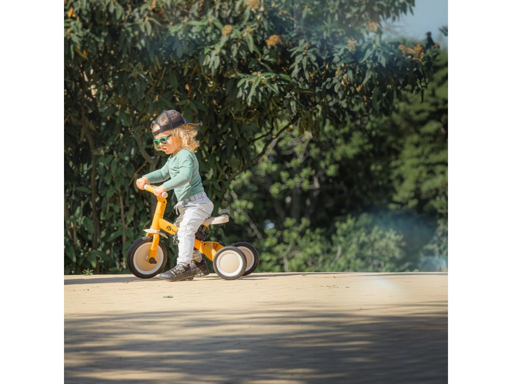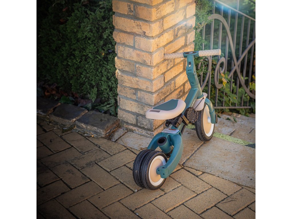 A csúszásgátló gumifogantyúkkal ellátott kormány állítható, a pedálok levehetők, a nyereg pedig a magassághoz igazodik, miközben az állítható biztonsági övek maximális biztonságot nyújtanak. A tartós gumikerekeknek köszönhetően a kerékpár ideális a két- és háromkerekű változatokhoz is, amelyek garantálják a stabilitást különböző felületeken.