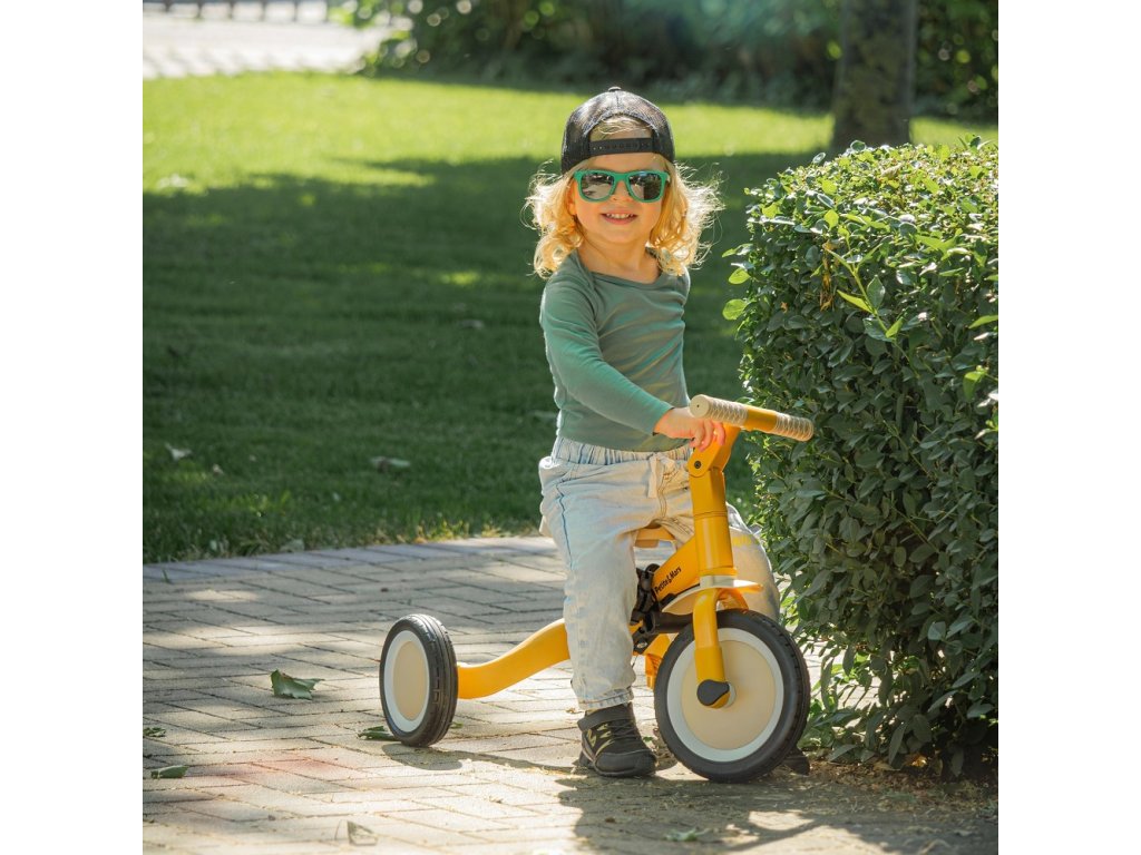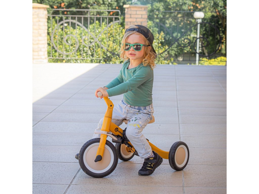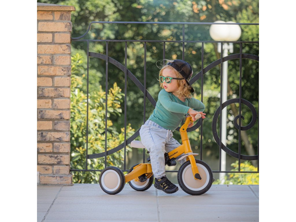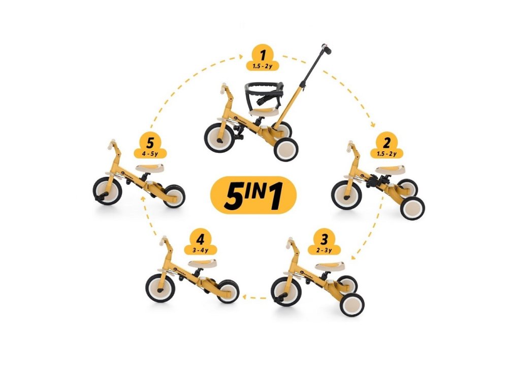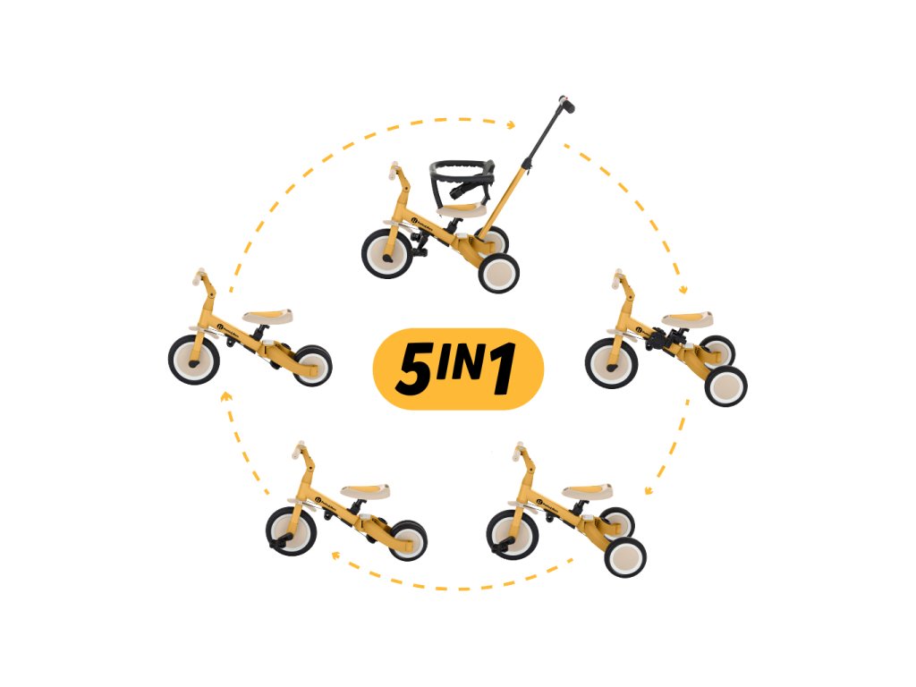 Multifunkcionális tricikli 1,5 és 5 év közötti vagy 25 kilogrammos gyermekek számára. Ez nemcsak egy közlekedési eszköz a mozgáshoz és az egyensúly megtanulásához, hanem egy társ is a növekvő gyermek számára a fejlődés számos szakaszában. A kerékpár átgondolt változtatása alkalmazkodik a gyermek igényeihez, ahogy motoros képességei fejlődnek. Kezdetben ez egy tricikli a szülői segítség lehetőségével, míg a végső verzió egy szabványos kerékpár pedálokkal, minden további támasztóelem nélkül. Az ilyen változtatásoknak köszönhetően segíthet gyermekének megtanulni két keréken közlekedni.