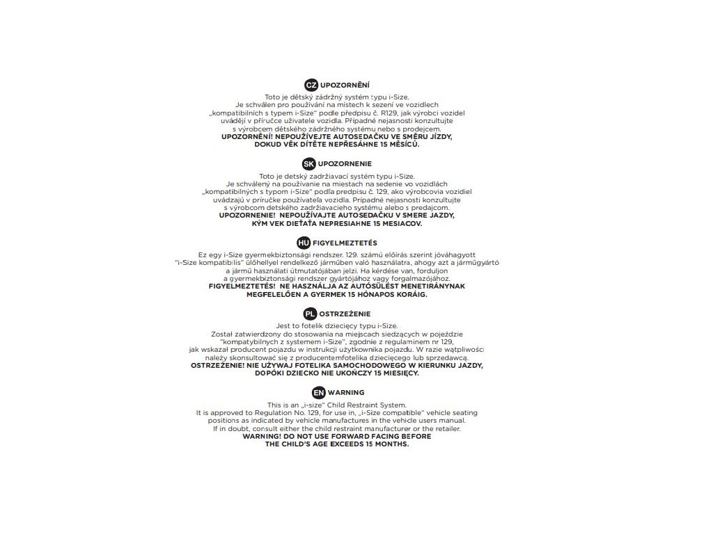 Ez egy i-Size típusú gyermekbiztonsági rendszer. Jóváhagyott a használata az i-Size típusú járművekkel kompatibilis üléseken, a 129. számú előírás szerint, ahogyan a jármű gyártói a jármű használati útmutatójában feltüntetik. Bármilyen kérdés esetén forduljon a gyermekbiztonsági rendszer gyártójához vagy a forgalmazóhoz.