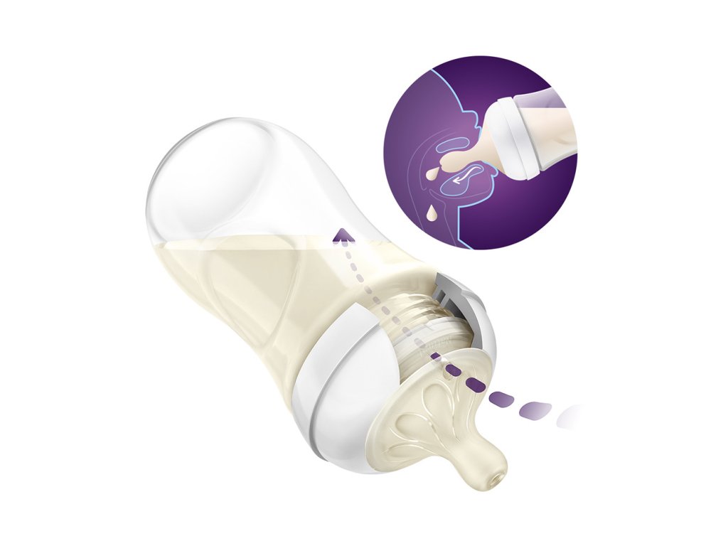 Az antikólásos szelepet úgy tervezték, hogy távol tartsa a levegőt a baba hasától, ezzel segítve a kólikaveszély és a kellemetlenségek csökkentését.