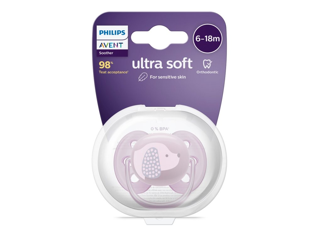 Nyújtson ápolást az érzékeny bőrnek a Philips Avent Ultrasoft cumival. A nagyon puha* és rugalmas felső rész követi a baba arcának vonalait, kevesebb nyomot és irritációt hagyva a bőrön.