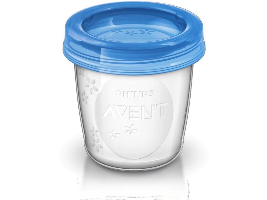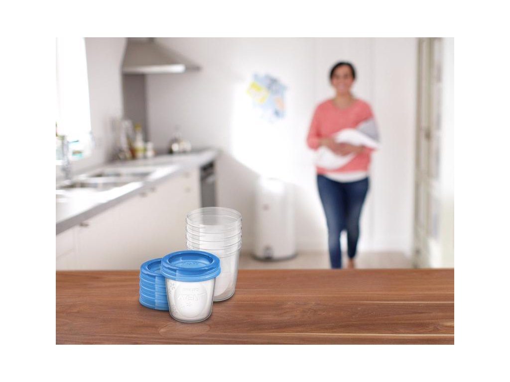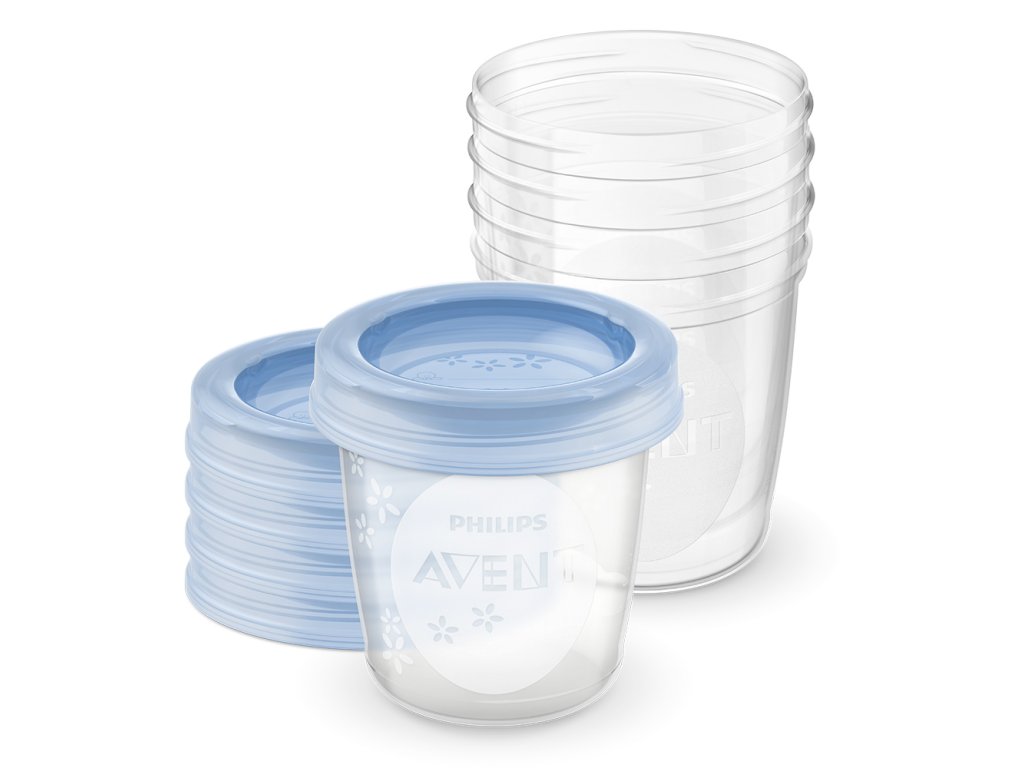 Az Avent VIA anyatejtároló poharak és bébiételek tárolására szolgáló készlet 5 db 180 ml-es VIA poharat tartalmaz fedővel.