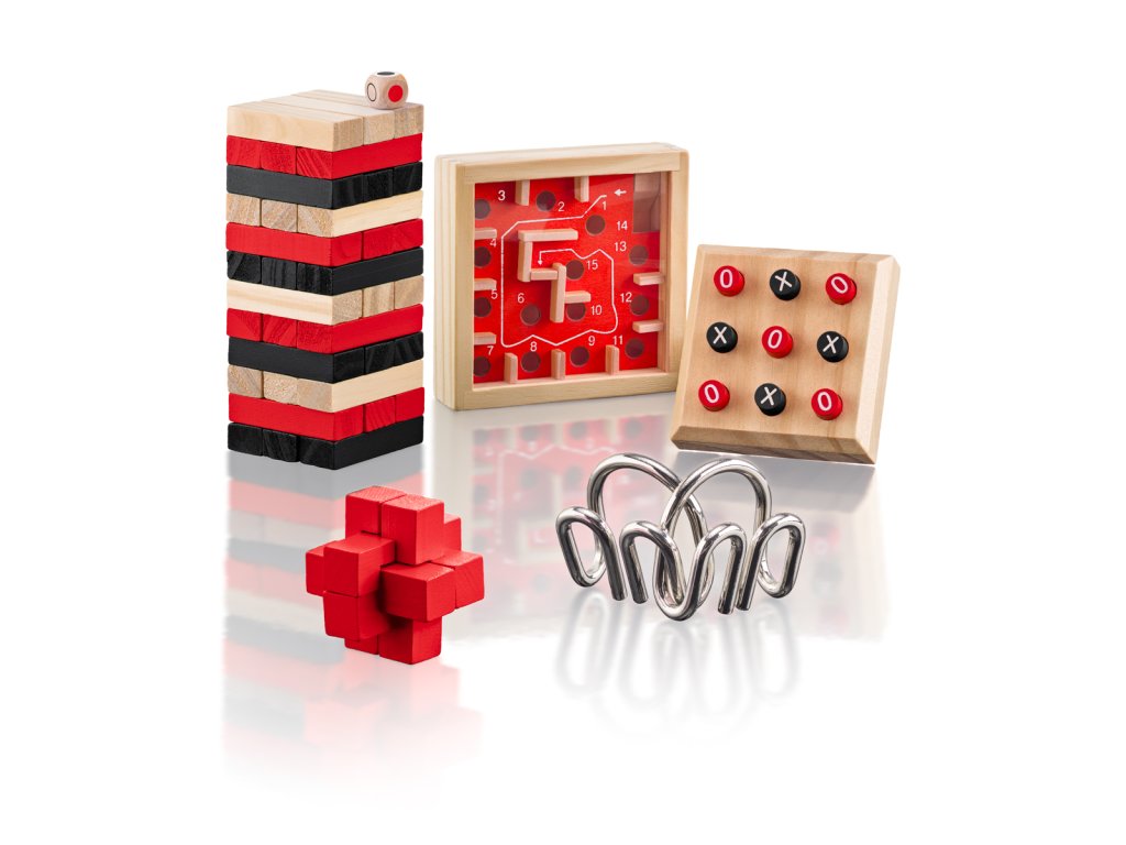 Mini játékkészlet és rejtvények fa/fém kivitelben. Belül nem csak ismert társasjátékok miniatűrjeit találja meg, hanem az egyes rejtvények megoldására vonatkozó útmutatókat is. Próbálja ki először az eszét, logikáját és türelmét!