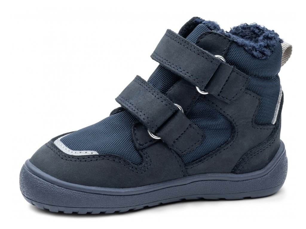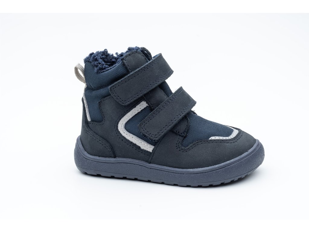 A fiúk téli barefoot cipői csiszolt bőr és minőségi textil anyag kombinációjából készülnek kék színben.