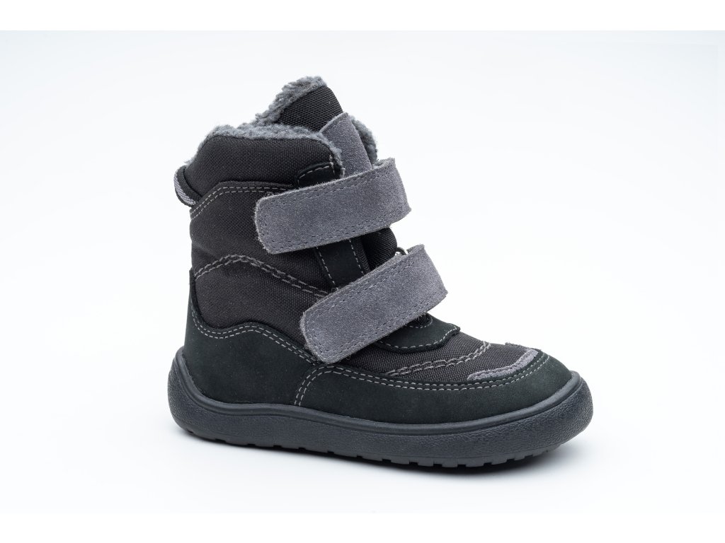 Újdonság! A fiúk téli barefoot cipői csiszolt bőr és textil kombinációjából készültek fekete színben, szürke csíkokkal kiegészítve.