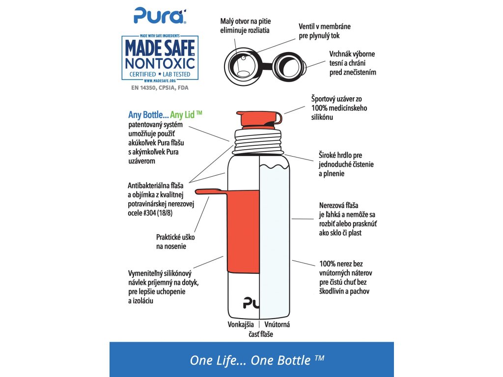 Végre egy biztonságos palack, amely 100%-ban műanyag alkatrészek nélkül készült. A Pura palackokkal biztos lehet benne, hogy nem szabadulnak fel káros anyagok és toxinok a benne lévő italba, sem ízek és szagok, mint a műanyag palackok vagy a műanyag kupakú palackok esetében. Semmi sem fontosabb, mint az Ön egészsége.A Pura palackok emellett az Ön igényeihez igazodnak. Az egyszerű kupakcserével a palack sportkupakos palackból szívókás, szalmaszálas vagy apró ételek tárolására alkalmas edénnyé alakítható. Így egy palackot sok évig használhat. One Life… One Bottle™.A legbiztonságosabb, legsokoldalúbb, könnyű és törésálló öko palack, amelyet több mint 35 díjjal tüntettek ki. Az első palack a piacon, amely 100%-ban műanyagmentes, és az egyetlen palack, amely MADE SAFE® tanúsítványt kapott. Any Bottle… Any Lid™ – a szabadalmaztatott rendszer lehetővé teszi bármely Pura palack használatát bármely Pura kupakkal. Így egyszerűen átalakíthatja a sportpalackot szívókás palackká, szívószállal ellátott palackká, vagy tömítőkoronggal ellátott edénnyé apró ételekhez. Egy palackot évekig használhat, miközben pénzt és a környezetet is kíméli. A palack és a foglalat első osztályú, 304-es (18\/8) rozsdamentes acélból, a többi rész pedig a legmagasabb orvosi minőségű szilikonból készül. BPA-, PVC-, ftalát- és egyéb veszélyes anyagoktól és toxinoktól mentes, az EU irányelveinek megfelelően tesztelve. A Pura Big Mouth sportzár 100% orvosi minőségű szilikonból készül. A kis ivónyílás megakadályozza a kiömlést, a szelep pedig biztosítja a folyadék egyenletes áramlását. A kupak kiválóan zár. Az egyszerű kialakítás, hozzáférhetetlen részek nélkül, megkönnyíti a tisztítást. A csomag tartalmaz egy cserélhető színes szilikon palackvédőt a jobb fogás és a szigetelés érdekében. Mosogatógépben mosható. Élettartam garancia a rozsdamentes acél alkatrészekre. Nem vonatkozik a palack mechanikai sérülésére. A Pura Big Mouth sportzár nem alkalmas szénsavas és forró italokhoz! Teljes űrtartalom: 850ml Súly: 242g Méretek: 7 x 24cm A csomag tartalma: 850ml-es rozsdamentes acél palack, rozsdamentes acél gallér, Pura Big Mouth szilikon sportkupak, szilikon hüvely füllel