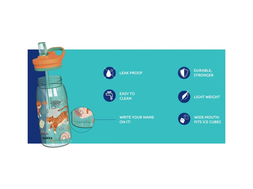 A Quokka Glow Kids gyermekpalack szívókával és szívószállal lehetővé teszi a könnyű ivást anélkül, hogy a palackot meg kellene dönteni. A felpattintható szívóka megakadályozza a palack tartalmának kiömlését. A széles száj lehetővé teszi jégkockák vagy gyümölcsdarabok behelyezését, és egyben megkönnyíti a palack tisztítását. A karbantartást a levehető széles szívószál is megkönnyíti. A fogantyúnak köszönhetően a palack könnyen hordozható.