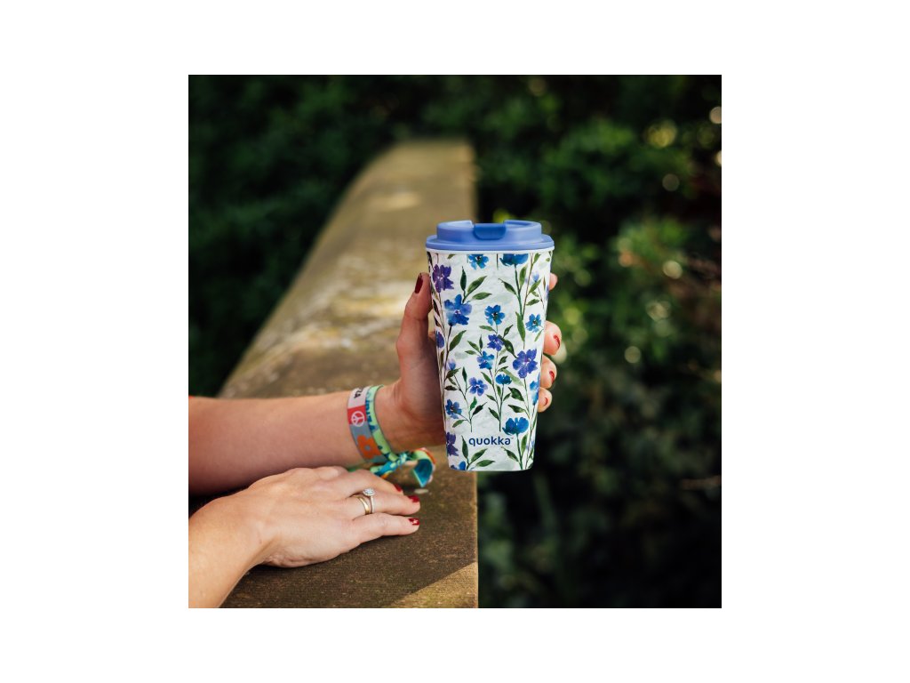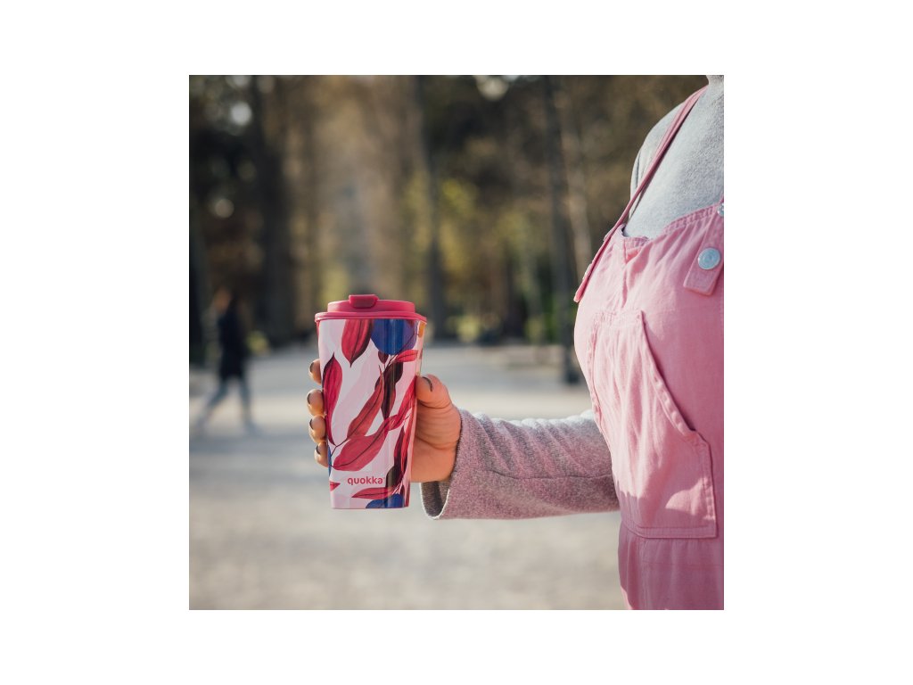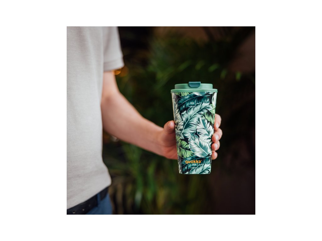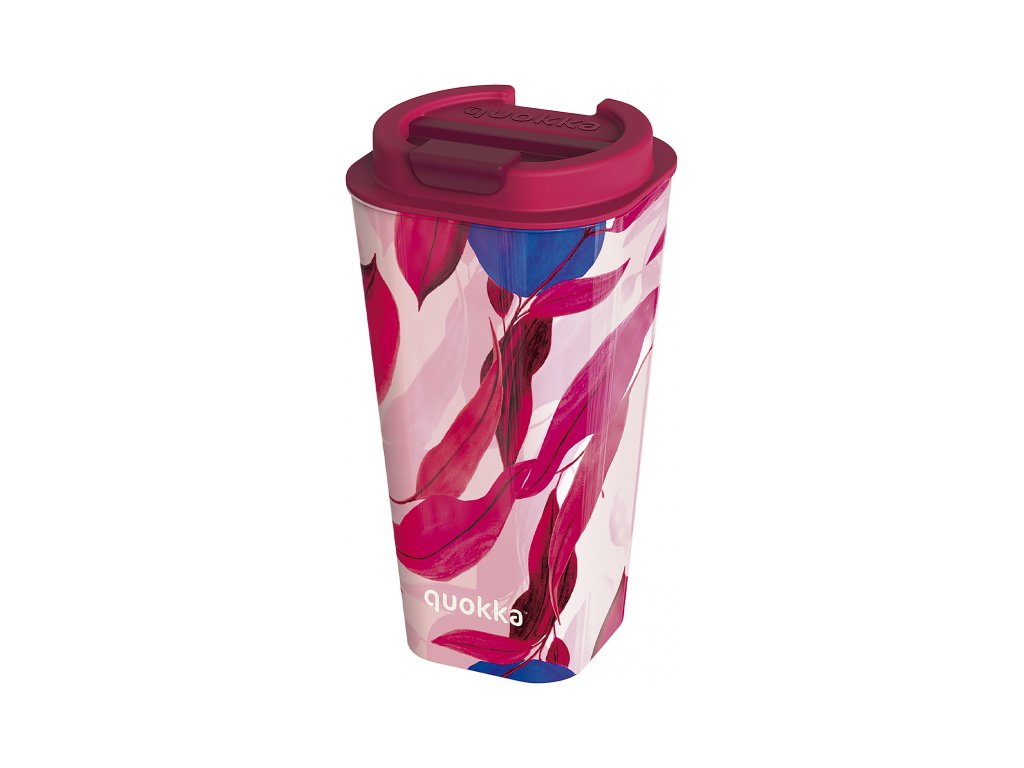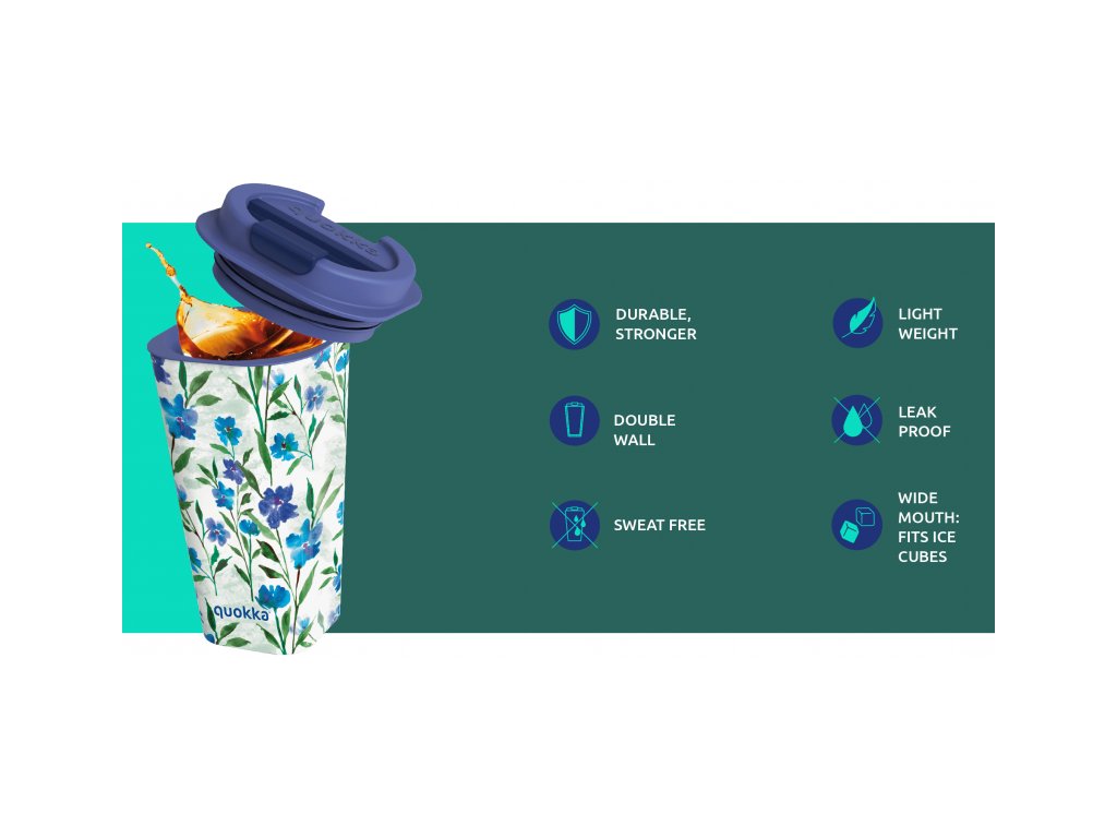 A Quokka Flux dupla falú műanyag utazóbögre megbízhatóan záródó, csavaros fedéllel és felpattintható zárral van ellátva. A széles száj lehetővé teszi a jégkockák behelyezését.