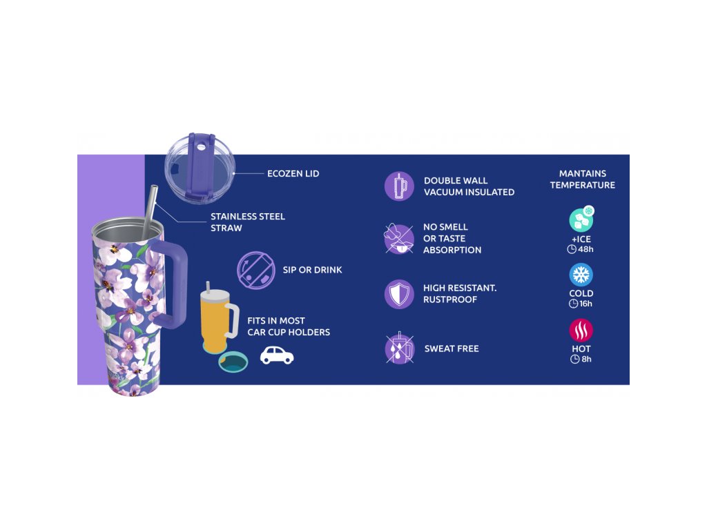 A kiváló minőségű, duplafalú acélból készült Quokka Stream termobögre akár 48 órán át hidegen tartja a jeges italokat, 16 órán át a hideg italokat és 8 órán át a meleg italokat. A kivehető rozsdamentes acél szívószállal ellátott termobögre lehetővé teszi a könnyű ivást anélkül, hogy meg kellene dönteni. A minőségi Ecozen műanyagból készült megbízható záróelem megvédi a tartalmat a kiömléstől, és lehetővé teszi a termobögréből szívószál nélkül is az ivást. A széles száj lehetővé teszi a jégkockák behelyezését, és egyben megkönnyíti a bögre tisztítását.