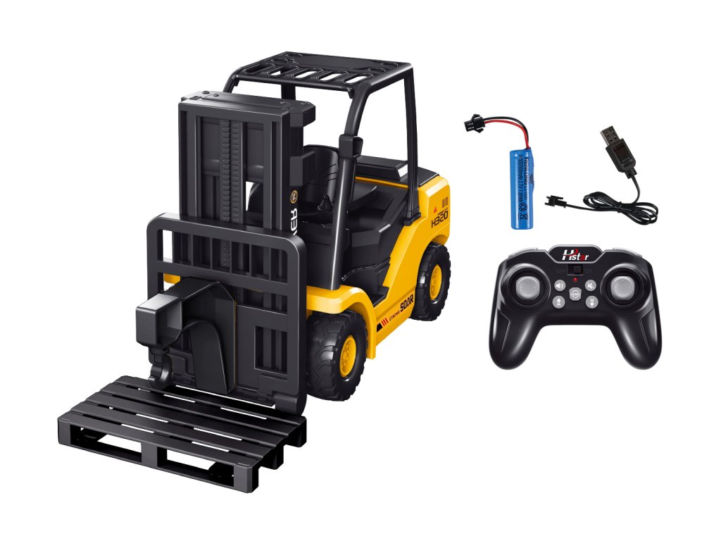 Távirányítású RC targonca. Realisztikus modell hanghatásokkal és teljesen működő rakodófelülettel. A csomag tartalmaz USB kábelt, raklapot és kampós adaptert. A targonca ON/OFF kapcsolóval rendelkezik az alján. A távirányító előre/hátra menetelést, balra/jobbra fordulást, kikapcsolható hanghatásokat, DEMO gombot, valamint a rakodófelület emelésének és leengedésének vezérlését kínálja. Frekvencia: 2,4 GHz. A targonca 3,7 V-os akkumulátorral van felszerelve (tartozék), a távirányító 2 db AA elemmel működik (nem tartozék). Targonca méretei: 34 x 12,5 x 18,8 cm. Csomag méretei: 47,5 x 25 x 16,3 cm. 3 éves kor alatti gyermekek számára nem alkalmas. Kor: 6+