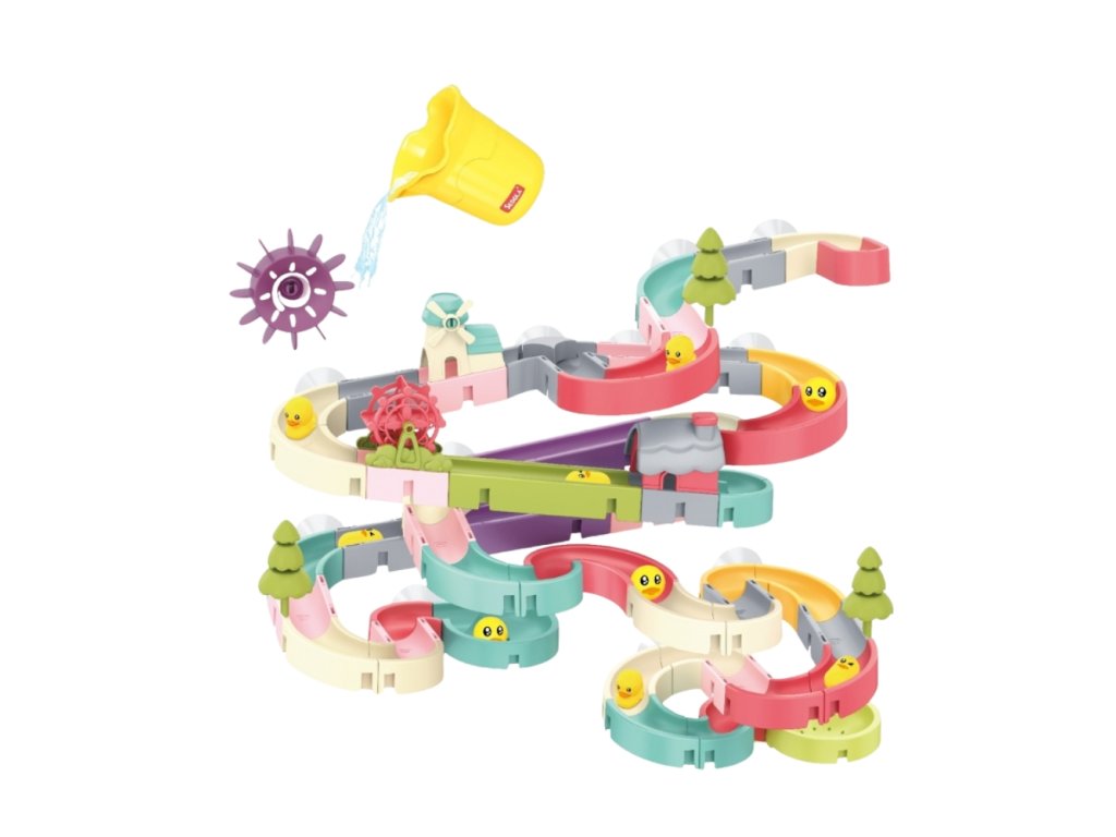 DIY vízi csúszda 86 dbVégtelen vízi kalandokA DIY vízi csúszda 86 db maximális lehetőséget kínál a gyerekeknek a kreatív és szórakoztató vízi játékhoz. Akár 86 darabbal a gyerekek saját csúszdákat és pályákat építhetnek, figyelhetik a golyók vagy kis játékok mozgását a vízben, és végtelen útvonal-kombinációkat hozhatnak létre.A csomag tartalmaz golyókat, kacsákat, víztartályt és számos kiegészítőt, mint például vízi malmot, víz kereket, fákat és egy házikót, amelyek akadályként szolgálnak a víz számára, és jelentősen gazdagítják a játékélményt. A gyerekek irányíthatják a víz áramlását, megváltoztathatják annak irányát, és figyelhetik, hogyan befolyásolják az egyes elemek a pálya menti mozgást.Ez a vízi építőkészlet fejleszti a finommotorikát, a logikai gondolkodást, a kreativitást és a térbeli képzelőerőt. A csúszda ideális játék a fürdőkádba, szenzoros tálakba, valamint otthoni vagy óvodai interaktív tevékenységekhez. Az elemek egyszerű összekapcsolása lehetővé teszi a konfigurációk gyors megváltoztatását és folyamatosan új, változatos vízi kalandok létrehozását. 3 éves kor alatti gyermekek számára nem alkalmas. Csak felnőtt közvetlen felügyelete mellett használható.