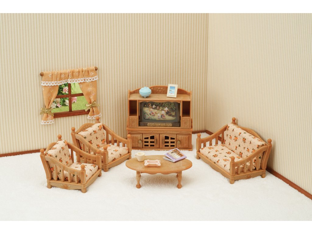 A nappali szoba kényelmes szettje tartalmaz egy kanapét, foteleket, egy dohányzóasztalt, egy TV-állványt és egy televíziót. A televízióban a képek cserélhetők/kiválaszthatók a TV-műsor megváltoztatásához (összesen 6 dia). A kanapé és a fotelek párnái lehetővé teszik a könnyű eltávolítást és a játékmódok megváltoztatását. Az egységes dizájn segítségével kombinálhatja a nappalit más szettekkel és további figurákkal, hogy még szórakoztatóbb szobát hozzon létre, ahol az egész család összegyűlhet (külön megvásárolható). A készlet több mint 15 kiegészítőt tartalmaz. Életkor: 3+