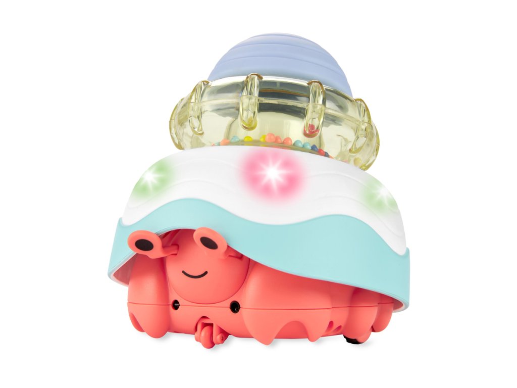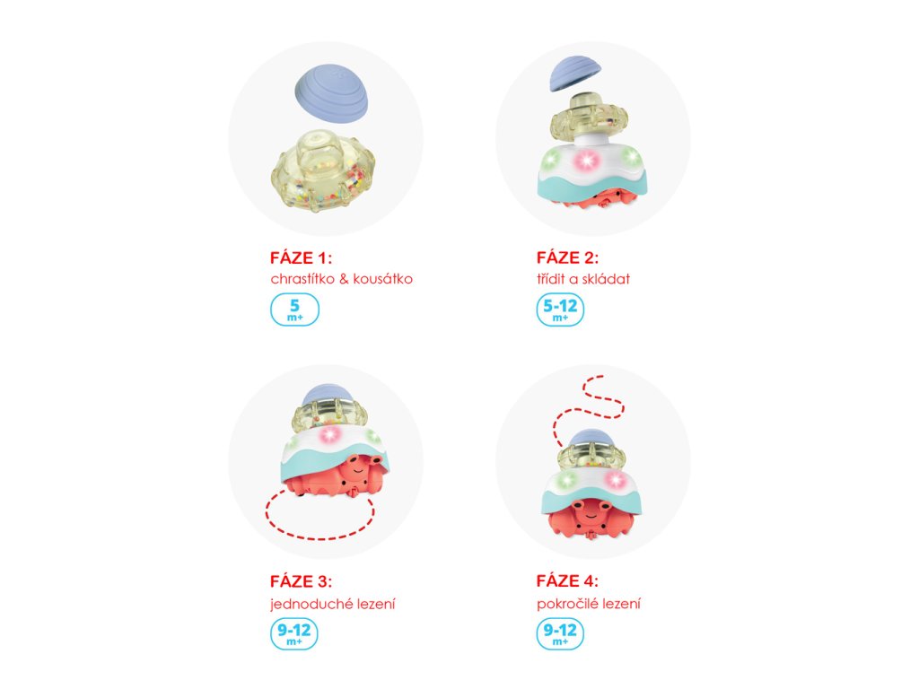 - A negyedik, haladó üzemmódban a rák véletlenszerű mintában mászik. Előrehaladás közben a páncél hátrafelé dől, és a rák meglepetten kikukucskál belőle. Amikor a rák lelassul vagy megáll, visszahúzódik a páncéljába. A játék fényekkel, zenével (3 dallal együtt) és hangokkal (6 hangeffektussal) jutalmazza a babát, ami hozzájárul a szórakozáshoz és az érzékszerveinek stimulálásához.