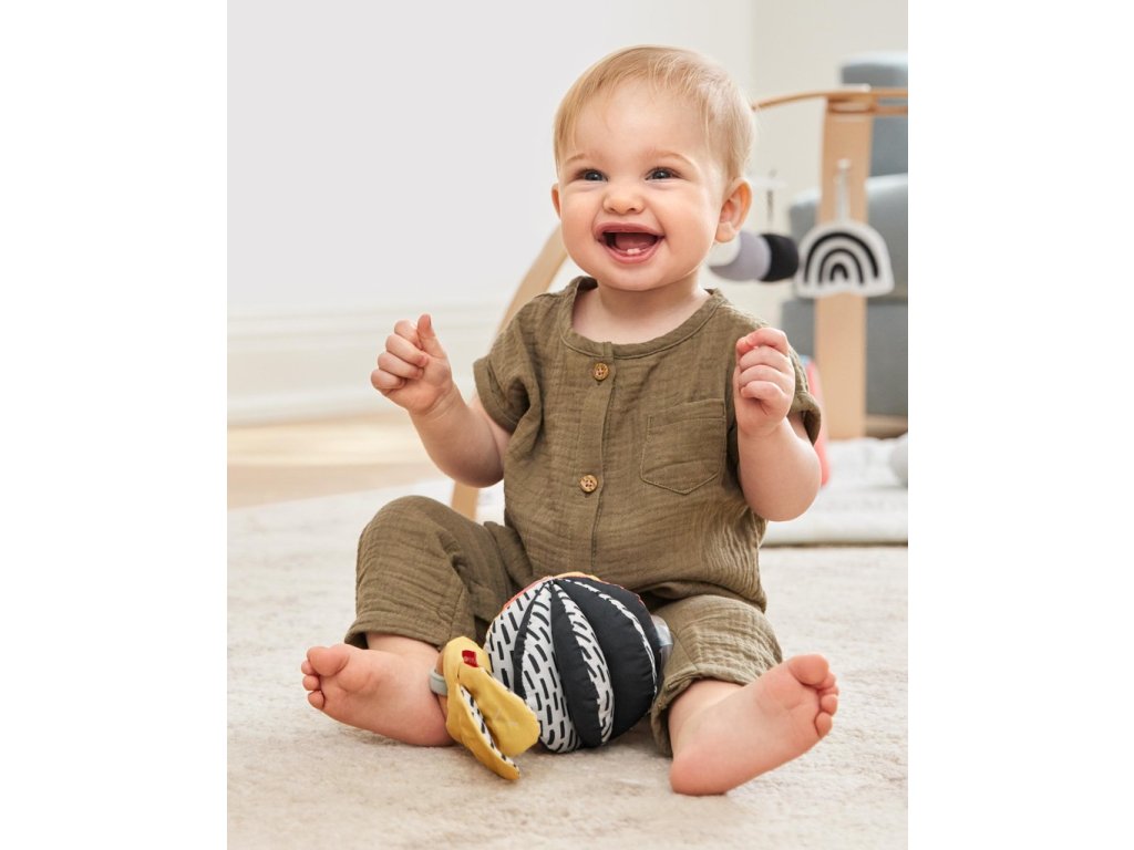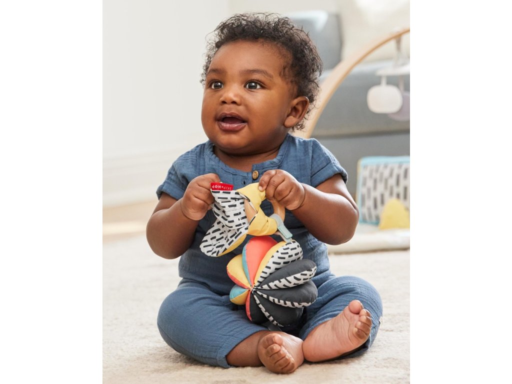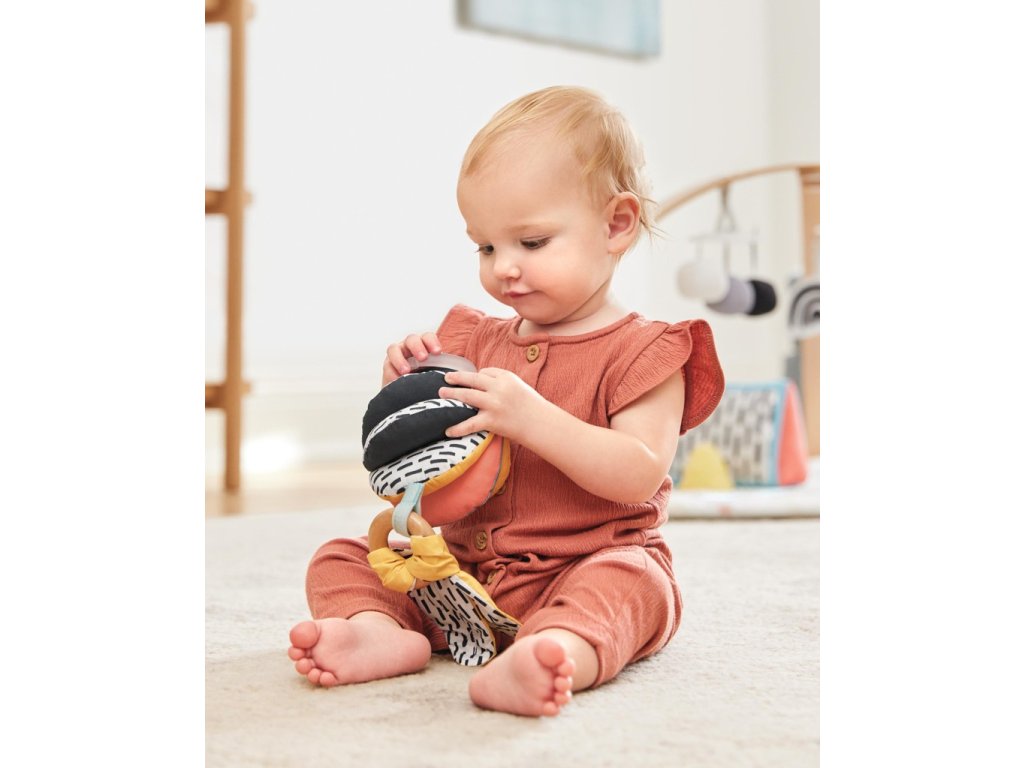 A Discoverosity 3 az 1-ben babajátékunk, amelyet a Montessori oktatás szakértőivel együttműködve terveztünk, támogatja a vizuális stimulációt, a motoros készségeket és más képességeket - otthon és útközben is. A kétrészes játék lehetővé teszi, hogy minden elemet külön-külön használjon, vagy összekapcsolja őket három különböző játékmódhoz. A puha, csörgő labda egyik oldalán erősen kontrasztos minta, a másik oldalán élénk színek találhatók, míg a fenntartható forrásból származó fa karika szilárd, fekete-fehér mintás anyaggal ideális a fogáshoz és a fogzáshoz.