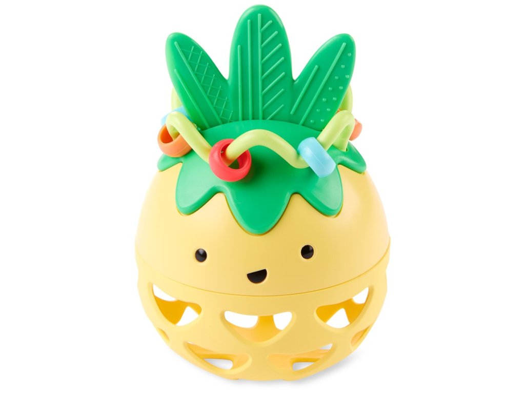 Édes ananász csörgőnk – kis kezek számára, amelyek könnyen megfogják, gurítják és rázzák. Multiszenzoros játékot és fogzásra alkalmas felületet kínál. A könnyen megfogható, gumírozott levelekkel, színes csörgő gyöngyökkel és egyéb elemekkel ellátott lyukak segítik a kis kezeket a készségek fejlesztésében, miközben támogatják a gurítást, a rázást és a dobást.