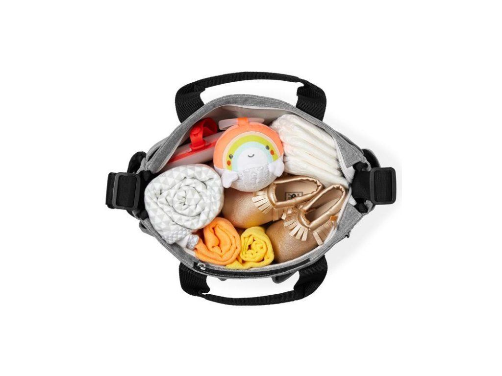 - A táska kényelmesen felakasztható a babakocsira, vagy szabadon hordható a vállon vagy a kézben
