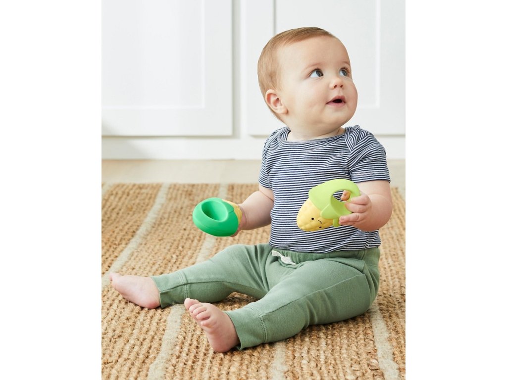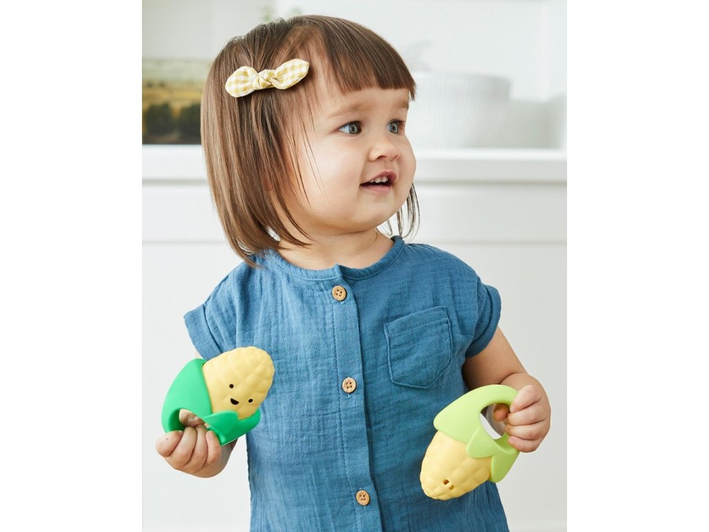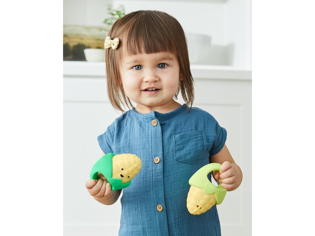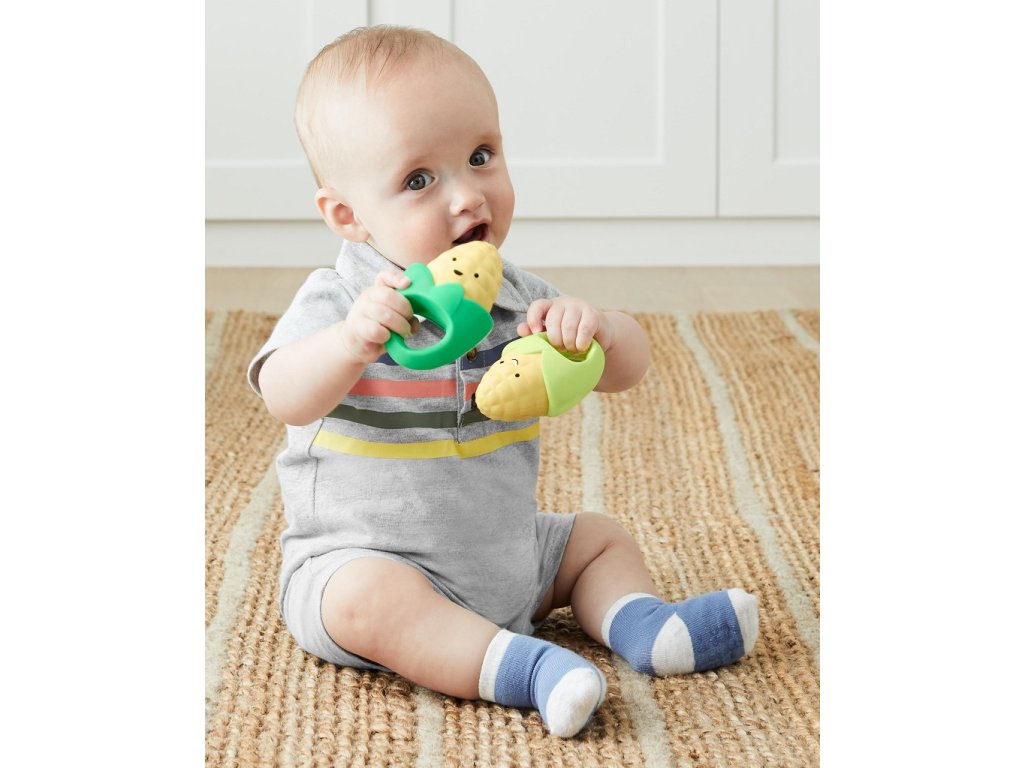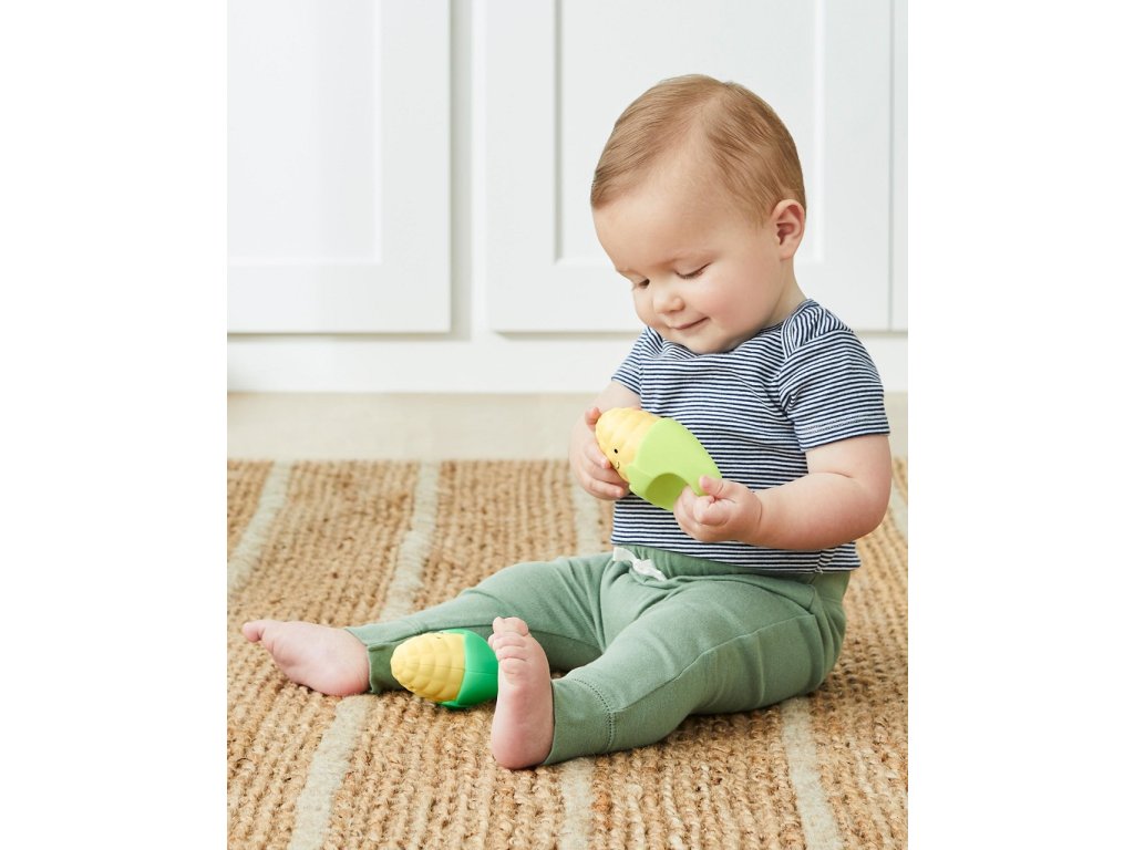 Gyermeke imádni fogja ezeket a csodálatos kukorica alakú csörgőket, akár hangos játékként, akár rágókaként. A csörgő könnyen megfogható formájú, és mindegyik más hangot ad ki a még nagyobb szórakozás érdekében.