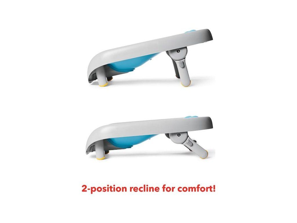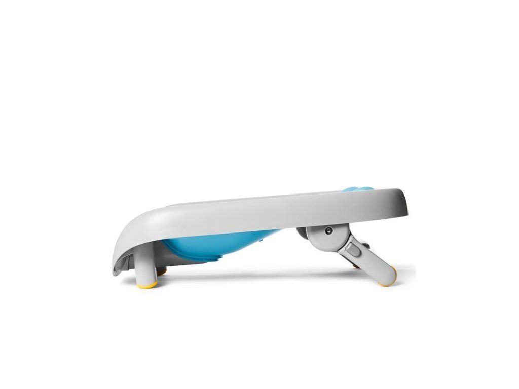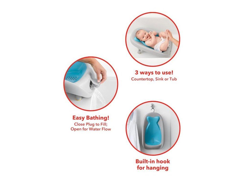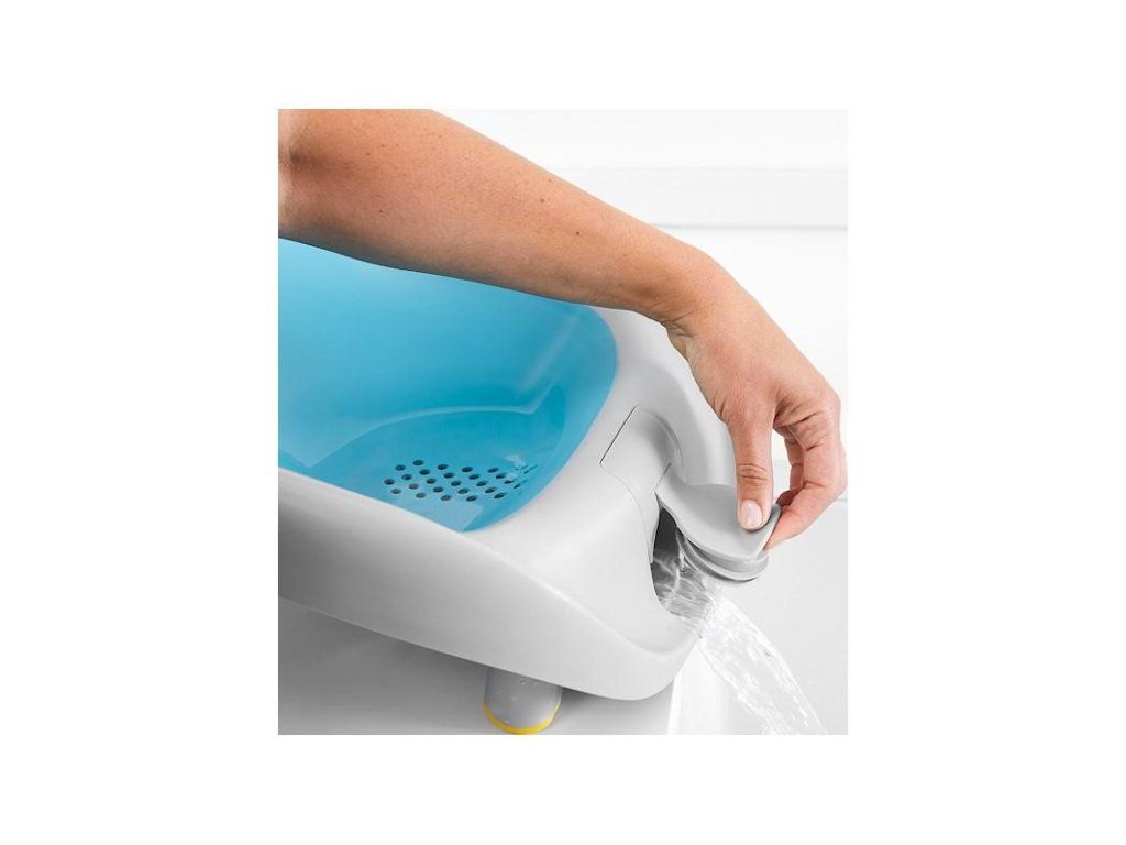 Háromféleképpen használható – a pulton, a mosogatóban vagy a kádban. A gyermek kényelme érdekében két különböző dőlésszöggel rendelkezik. Az okos vízszabályozó dugó lehetővé teszi a vízszint és az áramlás beállítását, míg a pihenőszék formázott kialakítása ringatja a gyermeket. A tárolás nagyon egyszerű – akassza fel a beépített kampó segítségével, vagy hajtsa laposra.