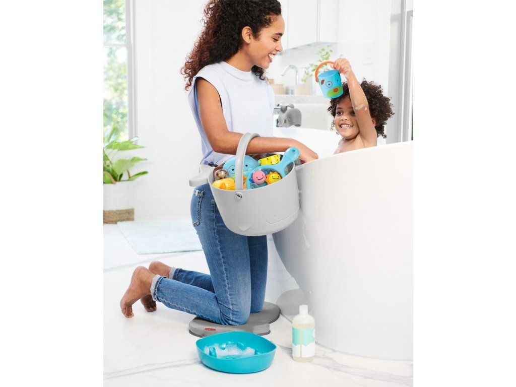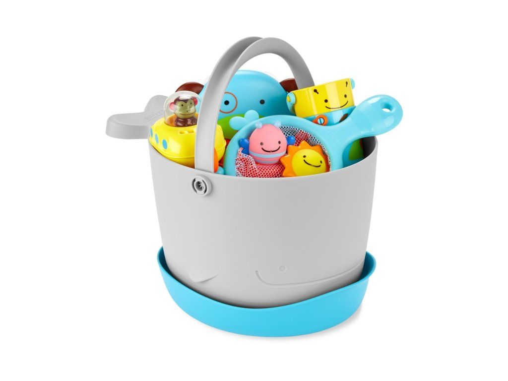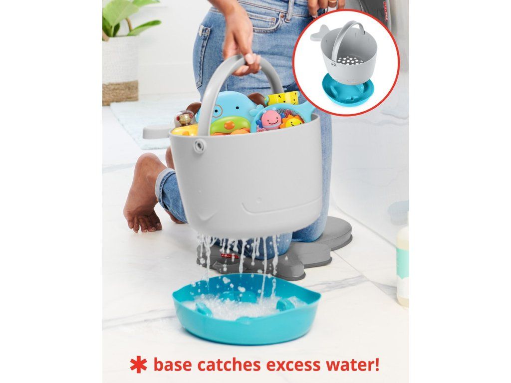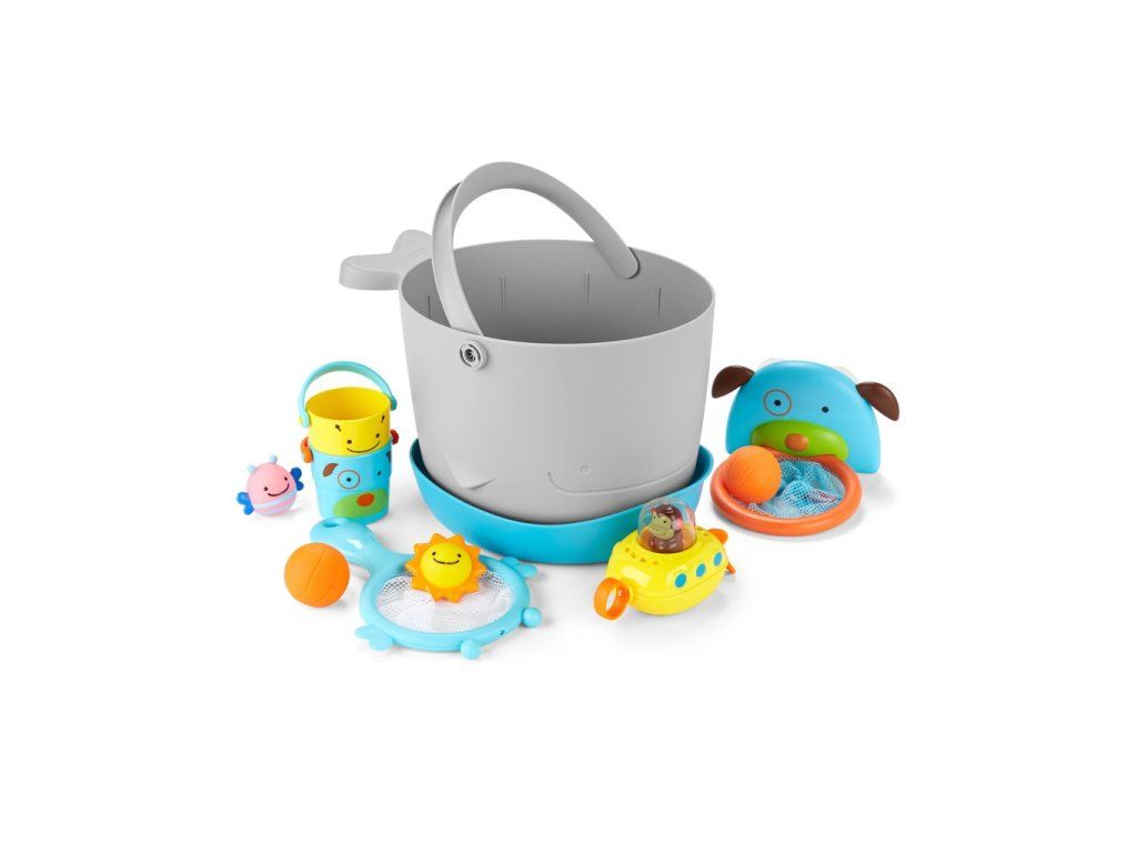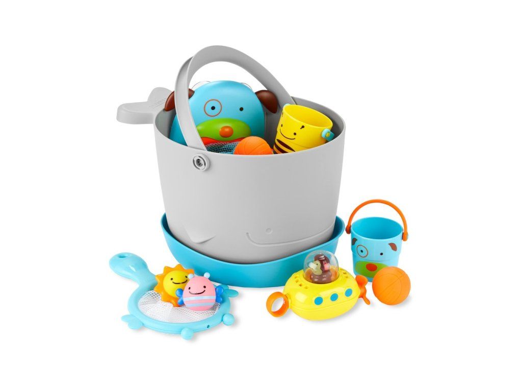 A vödrös fürdőjáték-készlet (gyönyörű állatfigurás dizájnnal) elnyeri a szülők és a gyerekek tetszését. A nagy vízelvezető nyílásoknak és a felesleges víz felfogására szolgáló különálló, álló alapnak köszönhetően a játékok szárítása és tárolása problémamentes.