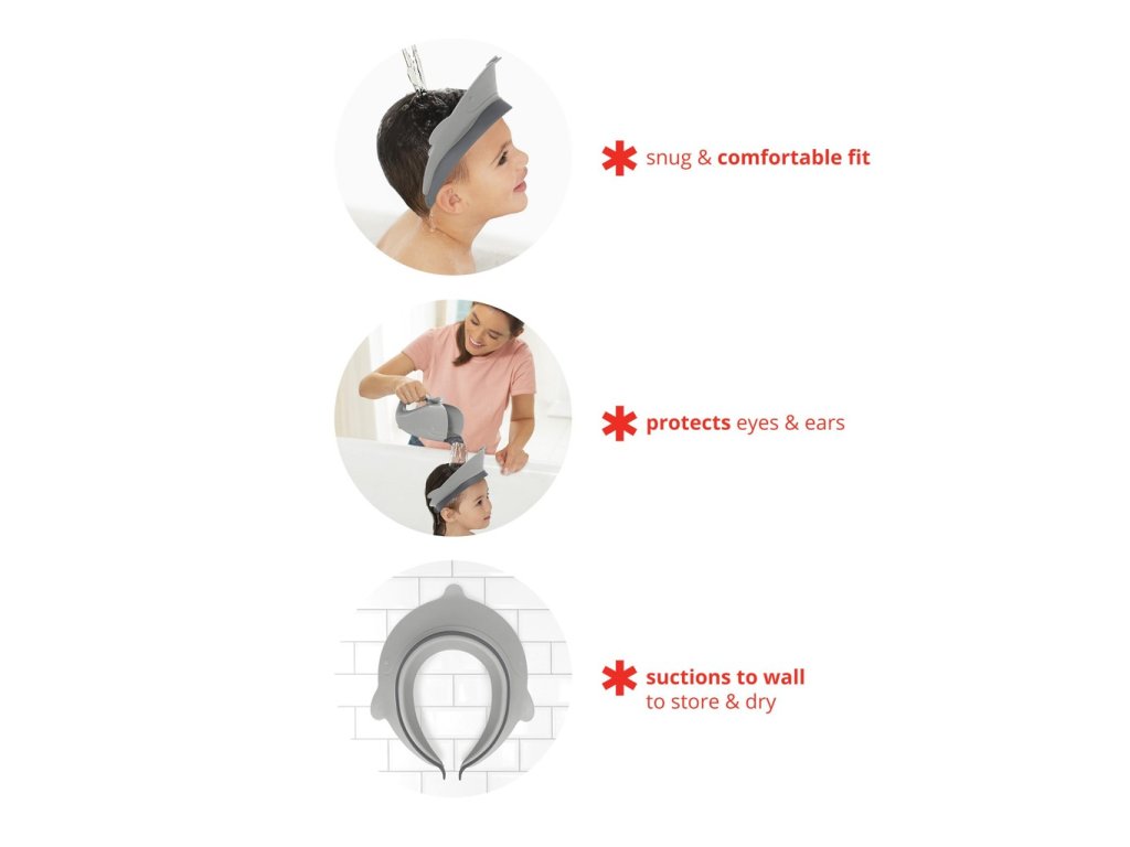 Nincs többé könny és sírás a kádban! A védőszemüveg a kényelmes és rugalmas anyagnak köszönhetően könnyen alkalmazkodik, és szorosan záródó tömítést képez, amely védi a kisgyermekek szemét és fülét a víztől és a sampontól. A nyitott hátsó rész megkönnyíti a hajmosást, míg a praktikus tapadókorong lehetővé teszi, hogy a szemellenzőt a fürdőszoba falára akassza, hogy megszáradjon és elrakja, de ugyanakkor kéznél legyen.