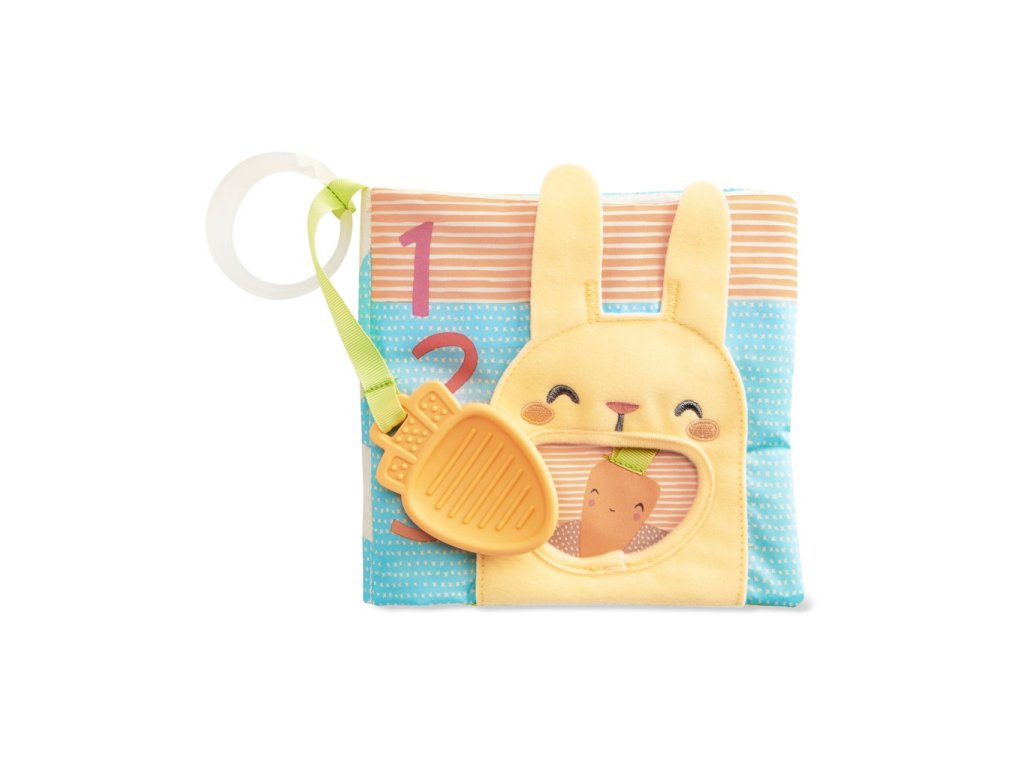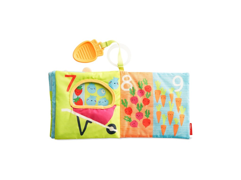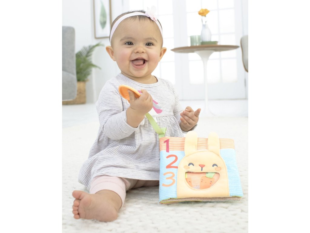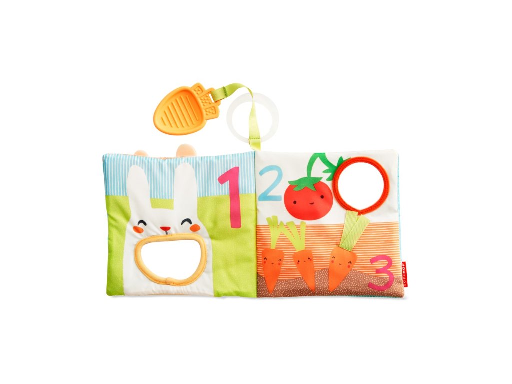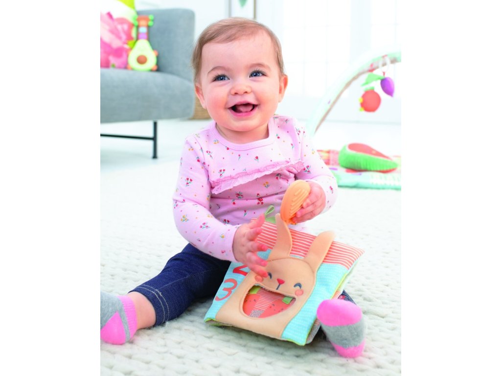Puha textil interaktív könyv aranyos képekkel és különféle tevékenységekkel. Különböző textúrák, susogó hang, színes számok, állatok, kerti motívumok, rágóka vagy tükör ösztönzik a gyermeket a felfedezésre, a kísérletezésre és a finommotorika gyakorlására. A répát behelyezheti és kiveheti a nyílásból, és bújócskát játszhat vele. A gyermek játék közben fejleszti érzékeit és képzelőerejét. A könyv ideális a szülőkkel való közös játékra, ahol a játék során segíti a gyermekek szókincsének fejlesztését.