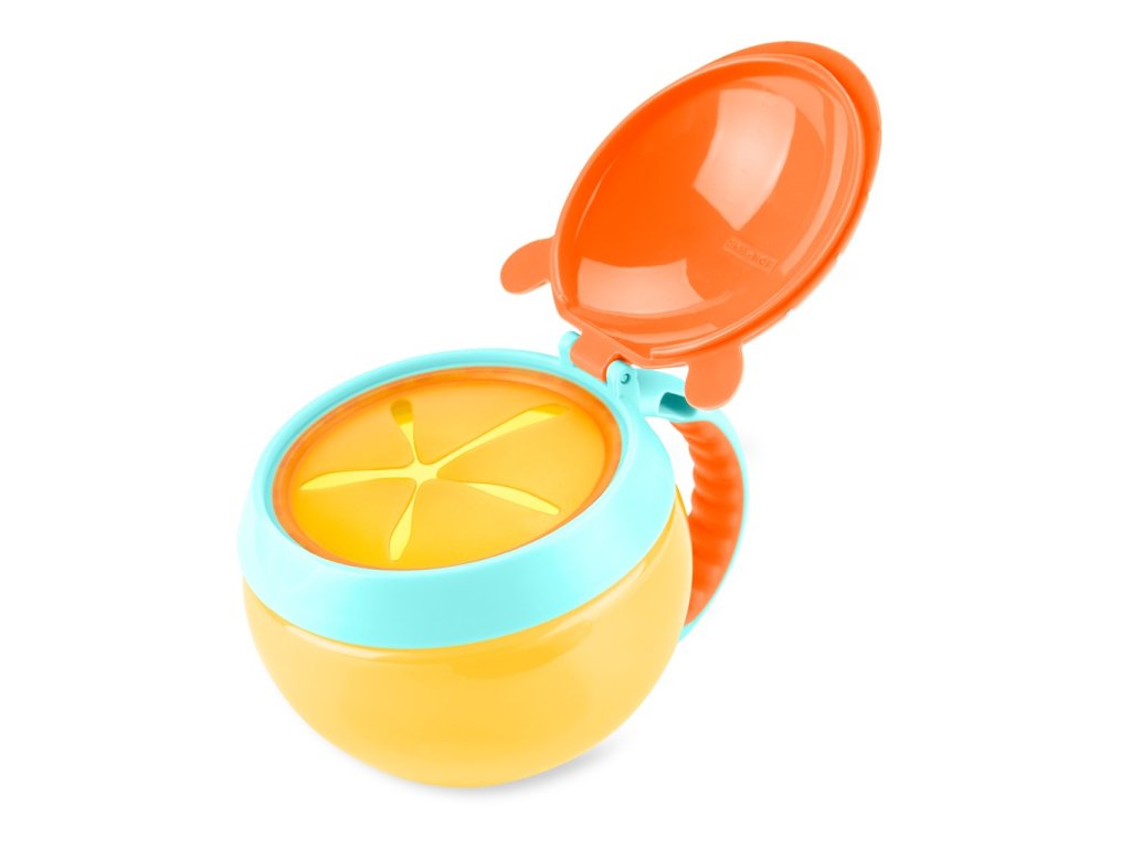 A tartó fedéllel rendelkezik, amely nyitás után a helyén marad, a tartalom kiöntését rugalmas lamellák védik, amelyek beengedik a gyermek kezét, de nem engedik ki a tízórait. A tartó átlátszó, hogy időben feltölthető legyen. Oldalán praktikus, gyermekméretű fül található, melynek segítségével a tartály babakocsira vagy táskára is rögzíthető.