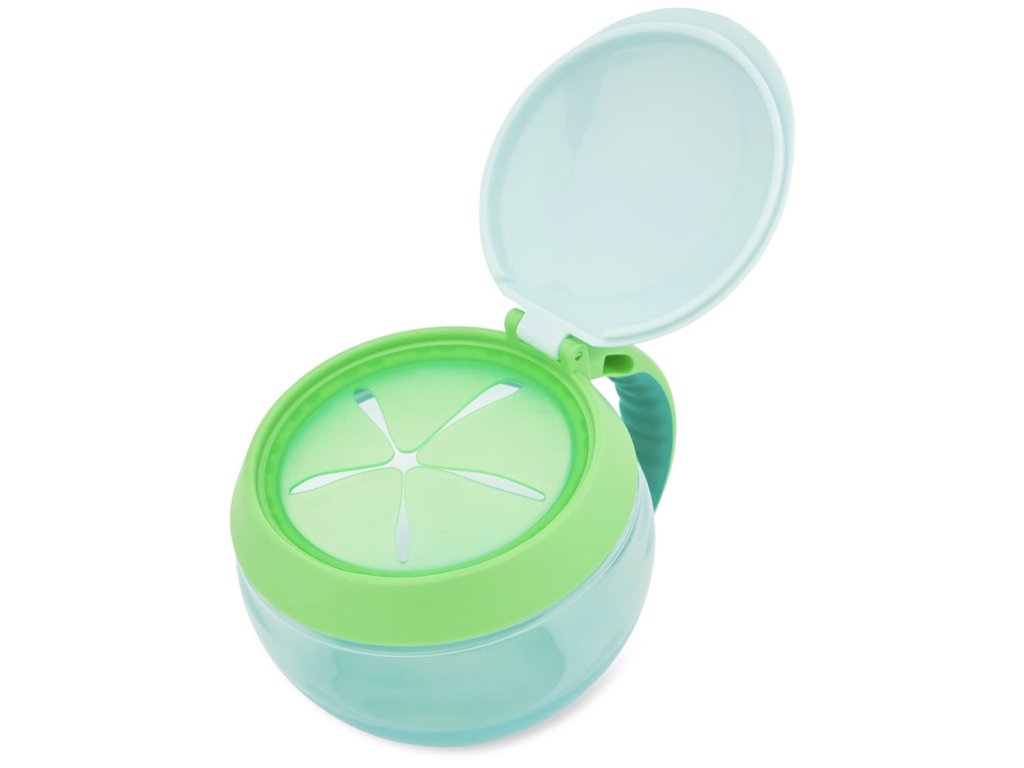 Okos ötlet utazáshoz. A tartó fedéllel rendelkezik, amely nyitás után a helyén marad, a tartalom kiöntését rugalmas lamellák védik, amelyek beengedik a gyermek kezét, de nem engedik ki a tízórait. A tartó átlátszó, hogy időben feltölthető legyen. Az oldalán praktikus, gyermekméretű fül található, amellyel a tartó a babakocsira vagy a táskára is rögzíthető. 0% BPA, 0% PVC, ftalátmentes. Űrtartalom: 222 ml. Átmérő: 10 cm