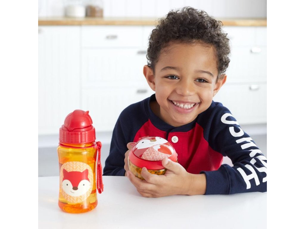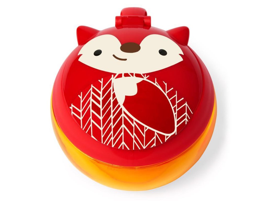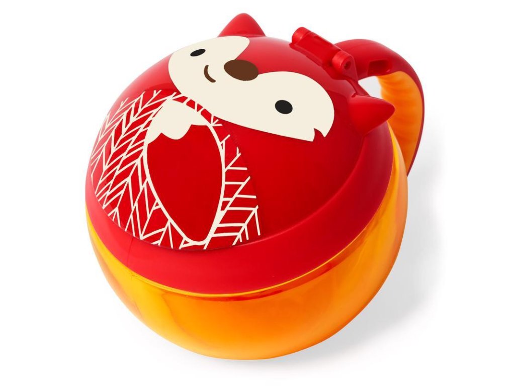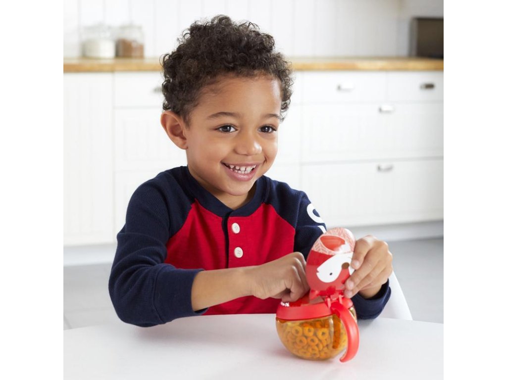Okos ötlet utazáshoz. A tartó fedéllel rendelkezik, amely nyitás után a helyén marad, a tartalom kiöntését rugalmas lamellák védik, amelyek beengedik a gyermek kezét, de nem engedik ki a tízórait. A tartó átlátszó, hogy időben feltölthető legyen. Az oldalán praktikus, gyermekméretű fül található, amellyel a tartó a babakocsira vagy a táskára is rögzíthető. 0% BPA, 0% PVC, ftalátmentes. Űrtartalom: 222 ml. Átmérő: 10 cm