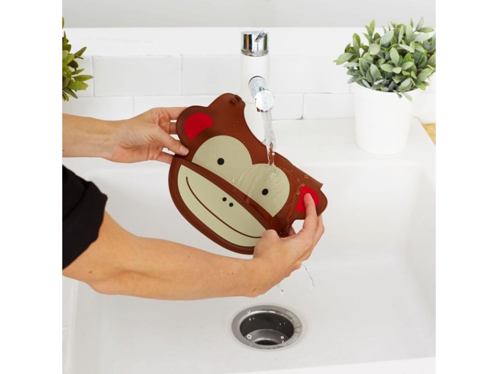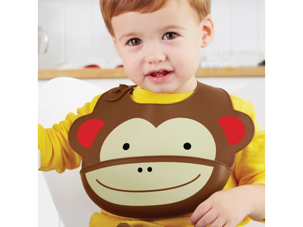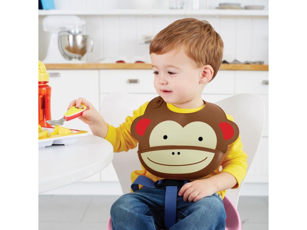 Skip Hop szilikon előke a Zoo kollekcióból, állatfigura formájában. Az előke felfogja a rosszcsont evők által leejtett ételt.