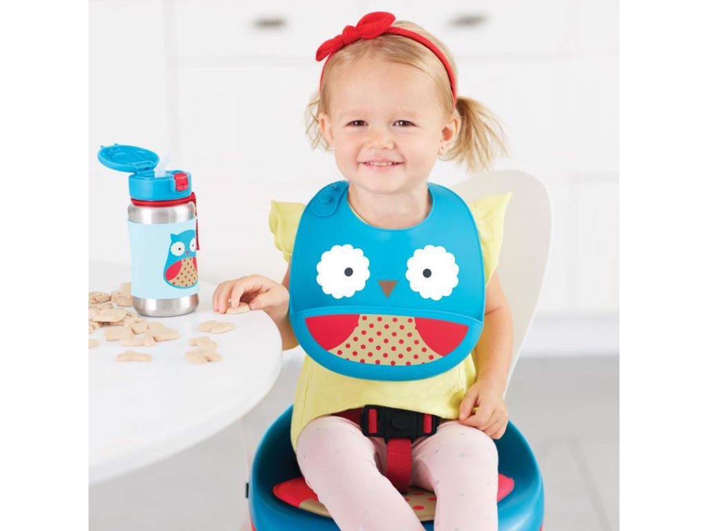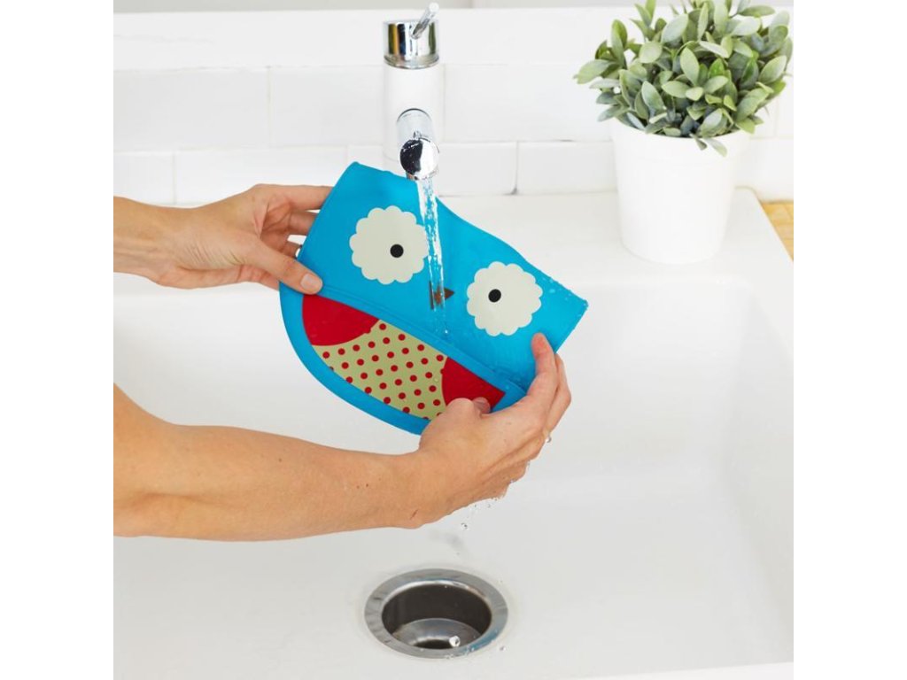 Skip Hop szilikon előke a Zoo kollekcióból, állatfigura formájában. Az előke felfogja a rosszcsont evők által leejtett ételt.