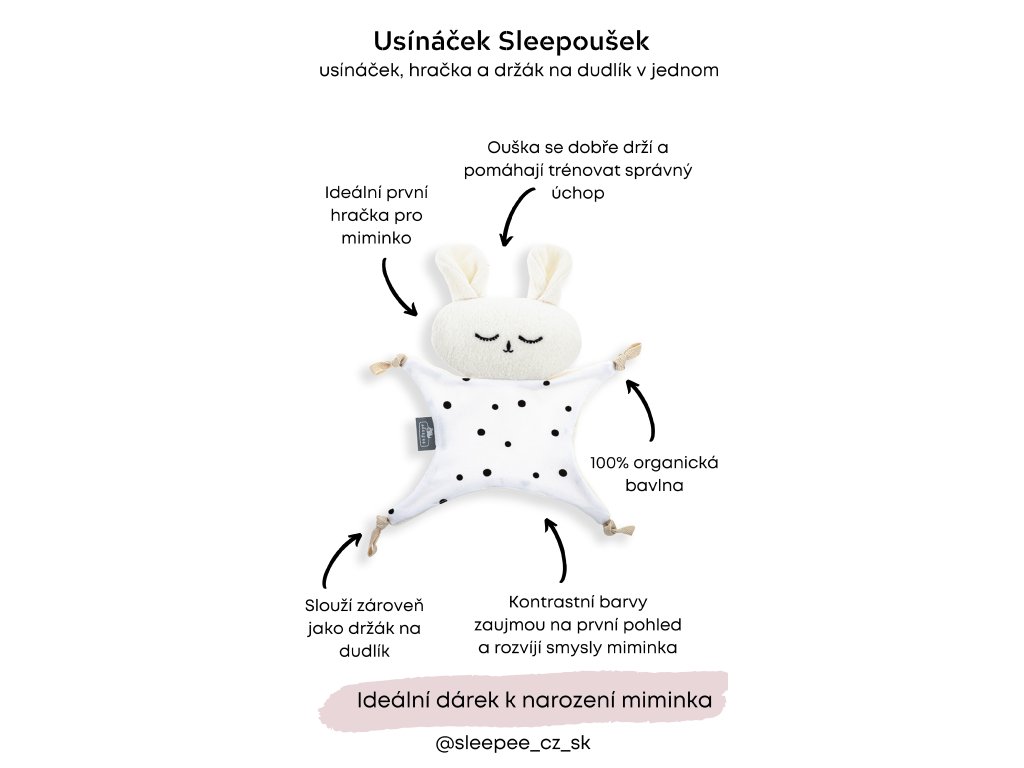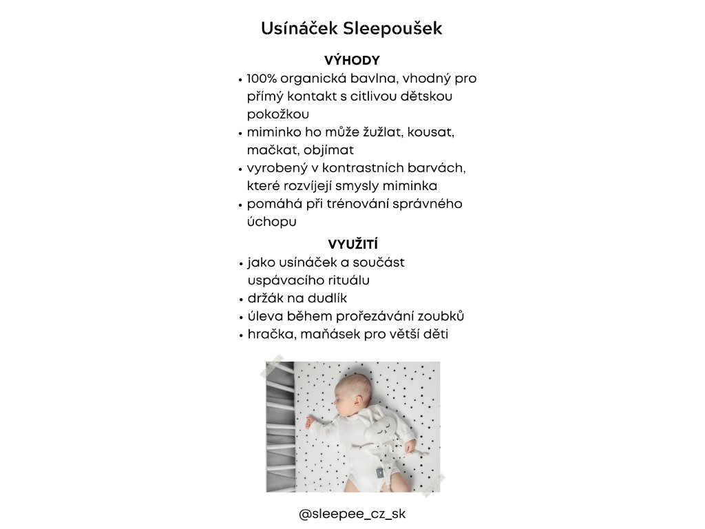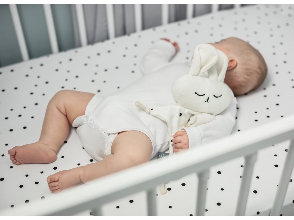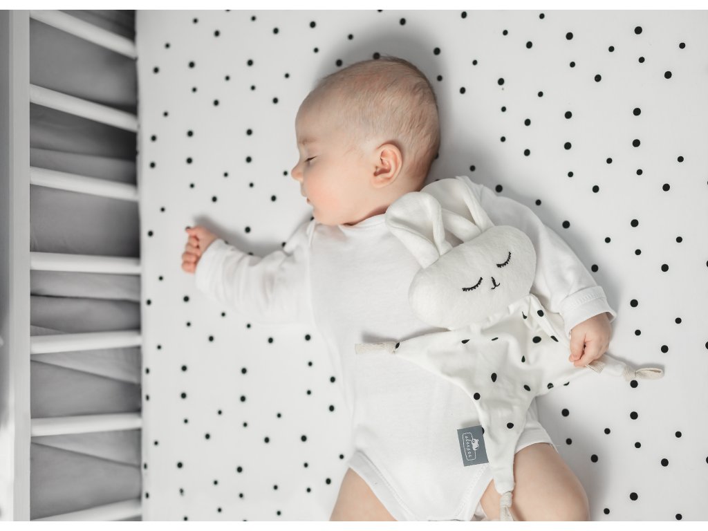 A tipikus Sleepee minta - fekete pöttyök fehér alapon - kontrasztos és támogatja a baba érzékszervi fejlődését.A fekete, a fehér és e színek árnyalatai az első színek, amelyeket a baba felismer.