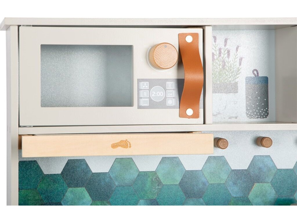 A Tasty konyha kiváló minőségű FSC® tanúsítvánnyal rendelkező fából készült. A modern, szürke árnyalatú dizájn stílusos bőr fogantyúkkal tökéletesen illeszkedik minden enteriőrbe. A hűtőszekrény és a sütő felületei konyhai részletekkel vannak nyomtatva, amelyek támogatják a képzeletet és a szórakozást.A gyermek készségek fejlesztése