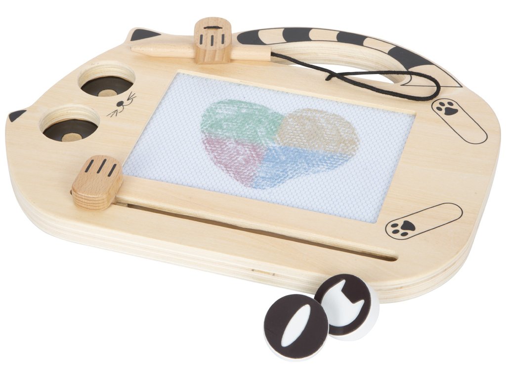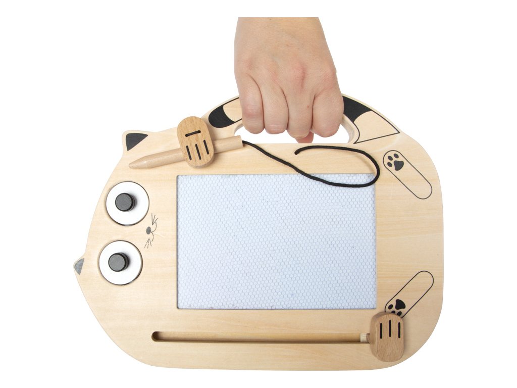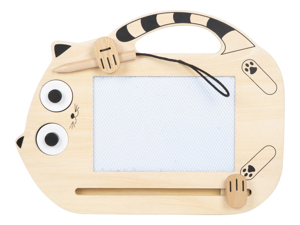 Mágneses tábla Macska Szórakozás rendetlenség nélkül! A Macska mágneses tábla végtelen szórakozást nyújt a kis művészeknek! Ez a cuki macska alakú rajztábla lehetővé teszi a gyerekeknek, hogy újabb és újabb képeket rajzoljanak és fessenek. A rugalmas zsinórral rögzített rajzolónak köszönhetően nem kell félni az elvesztésétől. A két mágneses pecsét macskaszemek és fejecske formájában további lehetőségeket kínál az alkotásra és a játékos felfedezésre. A műalkotás befejezése után egyszerűen húzza el a csúszkát, és a tábla máris készen áll a következő rajzolásra! A macska mancsai alatt található speciális tárolóhely biztosítja, hogy a rajzoló mindig kéznél legyen. Kompakt méretének és praktikus fogantyújának köszönhetően a tábla ideális útitárs. A gyerekek bárhol élvezhetik a kreatív szórakozást – otthon, autóban vagy nyaraláskor.