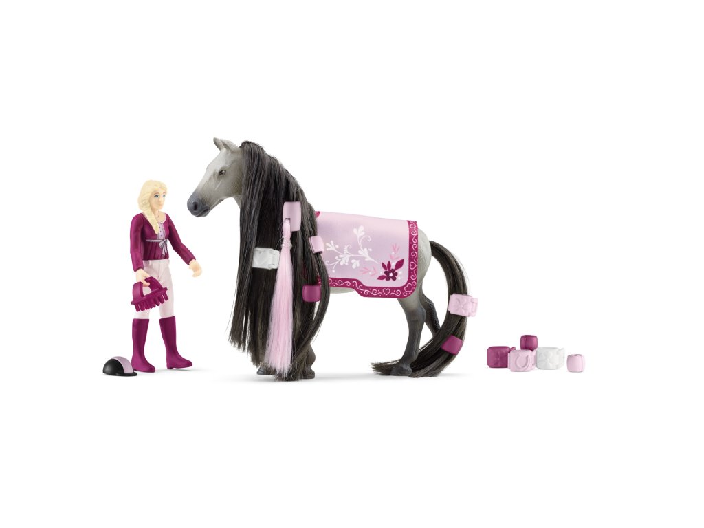 Nagyszerű! Sofia, a teljesen mozgatható figurám, és Dusty, a trakén kanca a Schleich® HORSE CLUB Sofia's Beauties kollekció Sofia és Dusty startcsomagjából, igazi életre szóló barátok. Mindketten a lovardában találkoztak, ahol a barátságos ló kedvesen ösztönözte Sofiát. Azóta elválaszthatatlanok. Valami olyasmi, mint a ketchup és a sült krumpli, vagy az iskola és a házi feladat. Csak jobb. Sokkal jobb. Mindketten szeretnek új frizurákat kitalálni Dustynak. Látod az összes színes hajtűt és gyöngyöt? Szinte lehetetlen megmondani, melyik a legszebb. Vagy már van kedvenced? A sörény és a farok szerencsére bármikor könnyen cserélhető, így tökéletesen összehangolhatod a frizurát a ruháddal. Például, ha a ló takarója, ami hozzá illik, a mosógépben van. Próbáld ki és meglátod! A készlet tartalma: 1× trakeeni kanca kefélhető sörénnyel és farokkal, 1× teljesen mozgatható Sofia figura, 1× ló takaró, 1× lovaglósapka, 1× hajcsat, 1× gyöngyök a sörényhez, 1× póthaj , 1× kefe . Méretek: 18,7 x 24,5 x 6 cm. Életkor: 3+